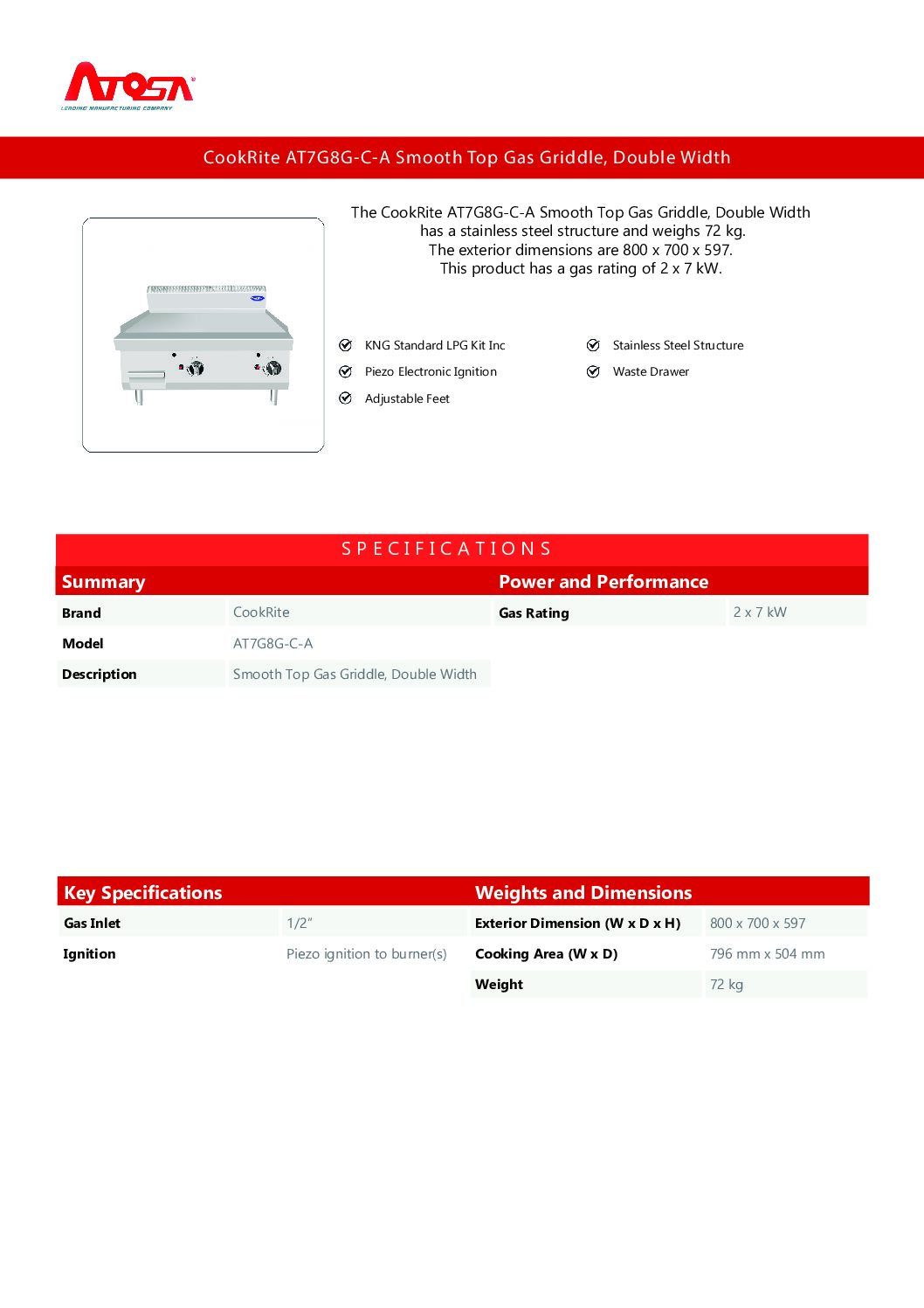 The Atosa CookRite AT7G8G-C-A is a double-width smooth top gas griddle designed for full-service kitchens, takeaways, and catering trailers. With a generous 796mm cooking area, it’s ideal for high-output environments where space and speed matter.