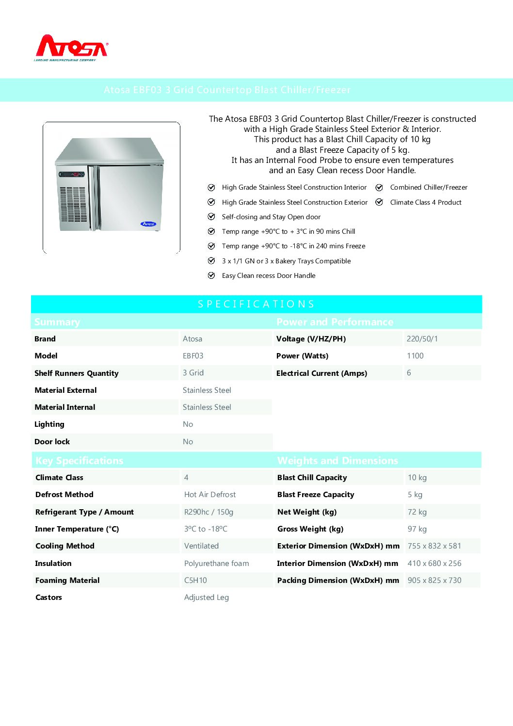 The Atosa EBF03 is a compact 3-grid countertop blast chiller and shock freezer, perfect for smaller kitchens or low-to-medium volume production. Whether you’re batch prepping for service or safely chilling food to comply with hygiene standards, this powerful unit gets it done fast — bringing cooked food from +90°C to +3°C in just 90 minutes, or to -18°C in 240 minutes.