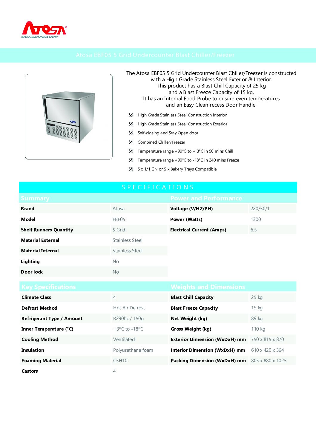The Atosa EBF05 Blast Chiller/Freezer is a powerful undercounter unit designed to rapidly chill or freeze freshly cooked food to safe storage temperatures. With the ability to accommodate 5 x 1/1 GN pans or bakery trays, it’s a vital asset for any busy commercial kitchen looking to retain food quality and meet hygiene regulations. Whether you’re batch cooking or preparing ahead of time, this combined blast chiller and shock freezer helps preserve texture, flavour, and nutrients — all while keeping you HACCP-compliant.