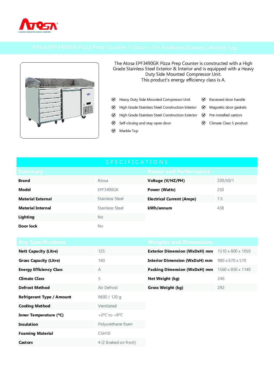 Designed for busy commercial kitchens, the Atosa EPF3490GR is a high-performance pizza prep counter featuring a durable marble worktop, one refrigerated section, and seven ambient drawers for added prep flexibility. With a heavy-duty compressor, ventilated cooling, and a climate class 5 rating, this unit is ideal for use in demanding environments such as pizzerias, bakeries, and fast-paced prep areas.
