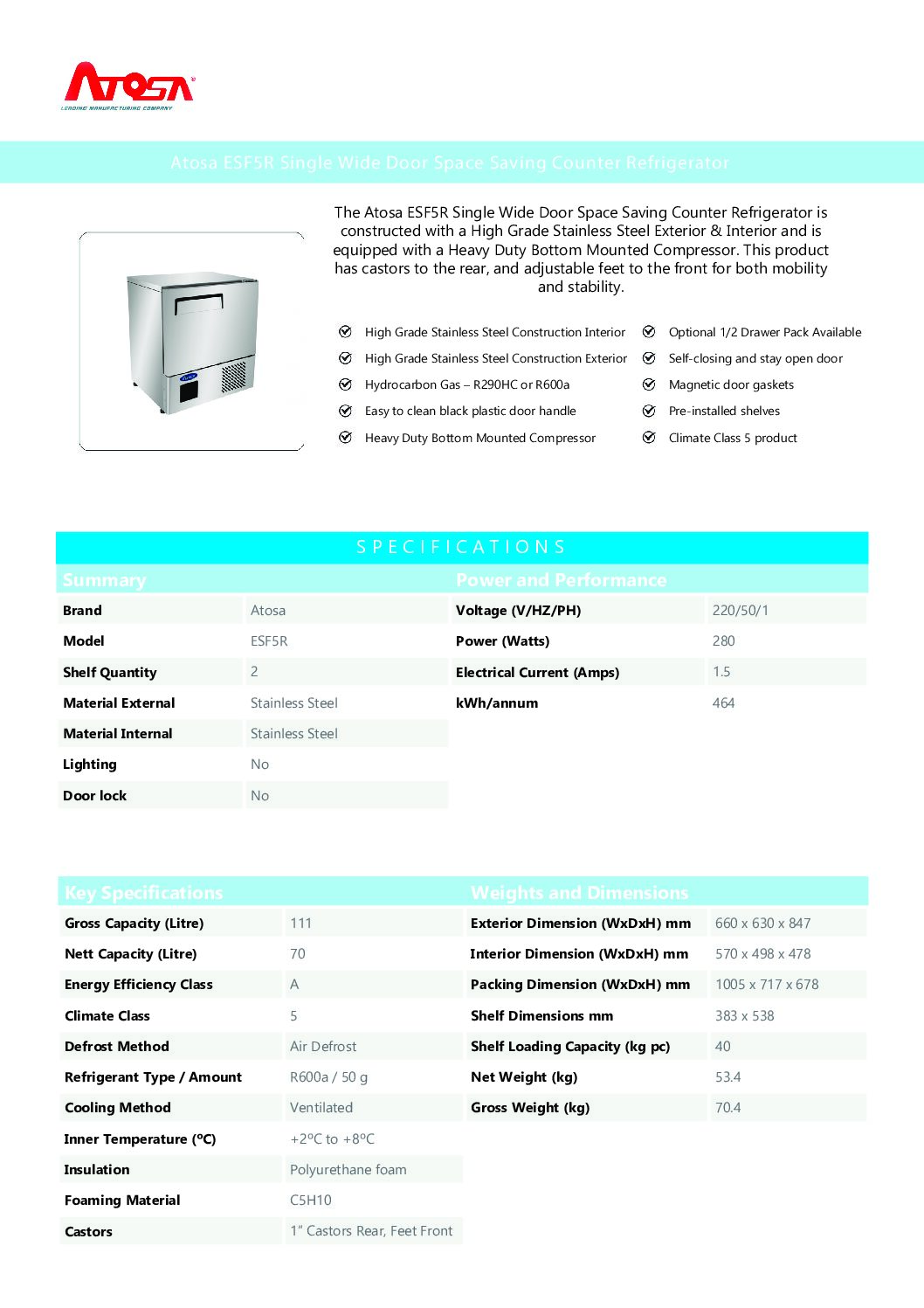 If you’re working with a compact kitchen layout but still need reliable refrigeration, the Atosa ESF5R is a smart choice. This single wide-door counter fridge offers 111 litres of gross capacity and a ventilated cooling system to maintain even temperatures throughout. Built to perform in busy hospitality environments, it’s perfect for undercounter positioning in cafés, bars, and food trucks.