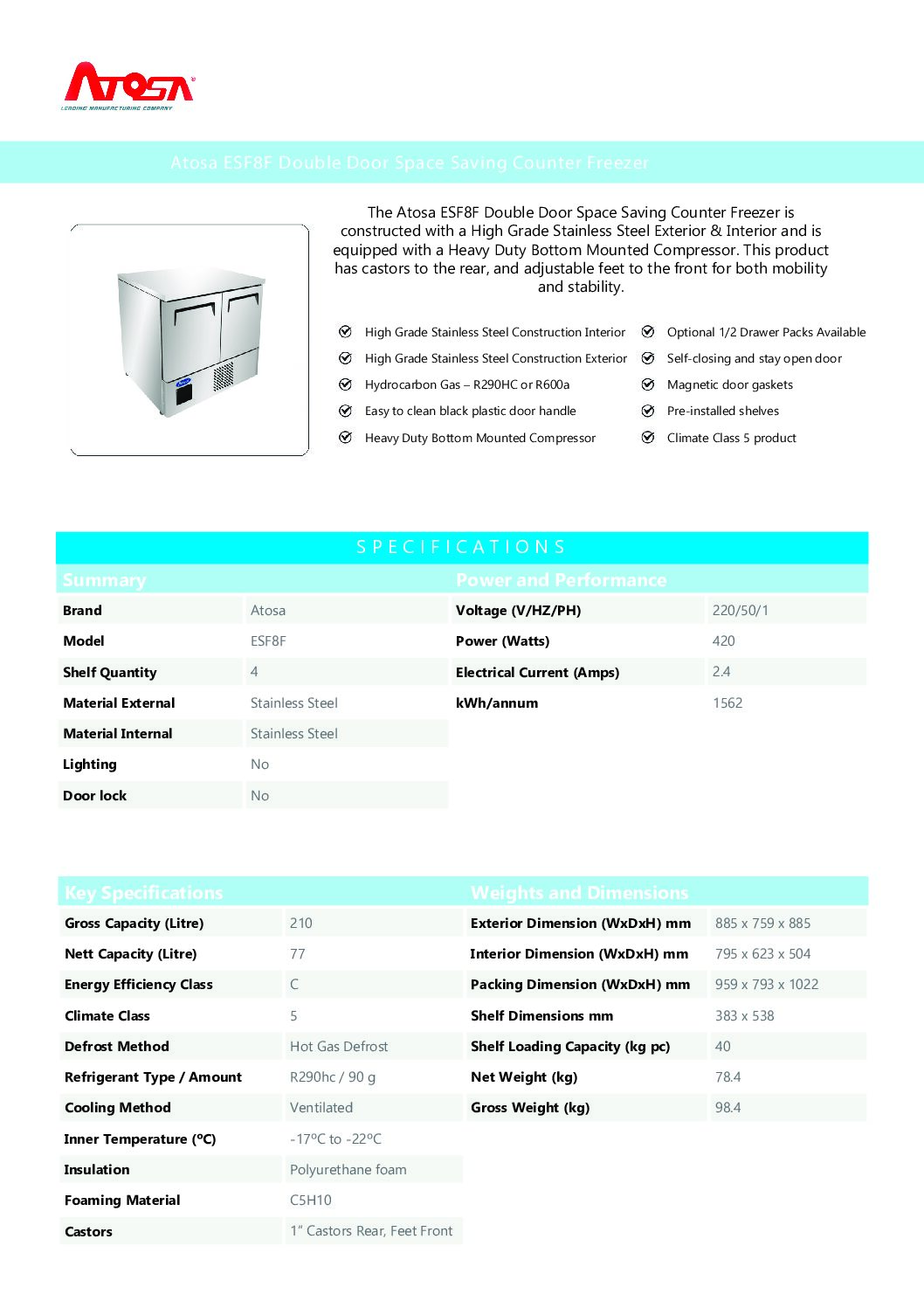 Maximise storage without compromising floor space. The Atosa ESF8F Double Door Space Saving Counter Freezer is a reliable, compact undercounter solution that delivers full commercial performance. With a durable stainless steel finish inside and out, this unit is ideal for fast-paced kitchens that demand hygiene, resilience, and efficient frozen storage. It fits neatly beneath most worktops, making it perfect for kitchens with limited space.