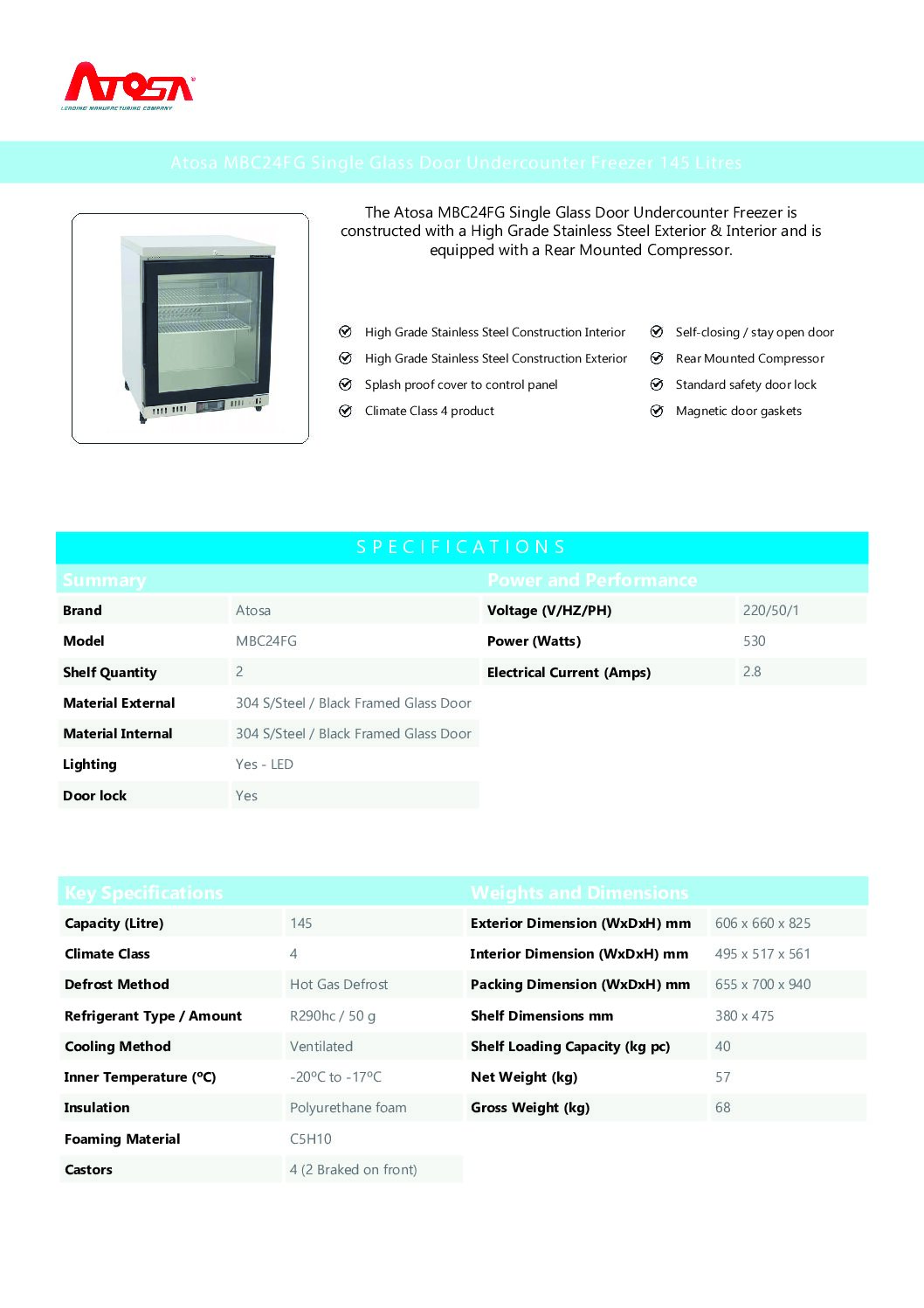 Designed for style and performance in equal measure, the Atosa MBC24FG is a space-saving glass door undercounter freezer built for busy commercial environments. With a 145L gross capacity and forced air cooling, it’s an ideal fit for bars, front-of-house stations, and catering setups where product visibility and reliability matter.