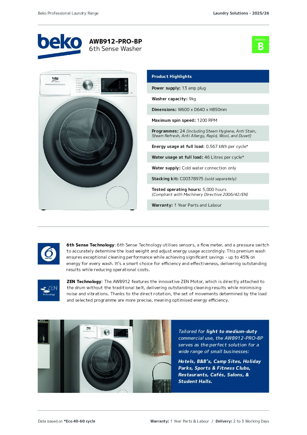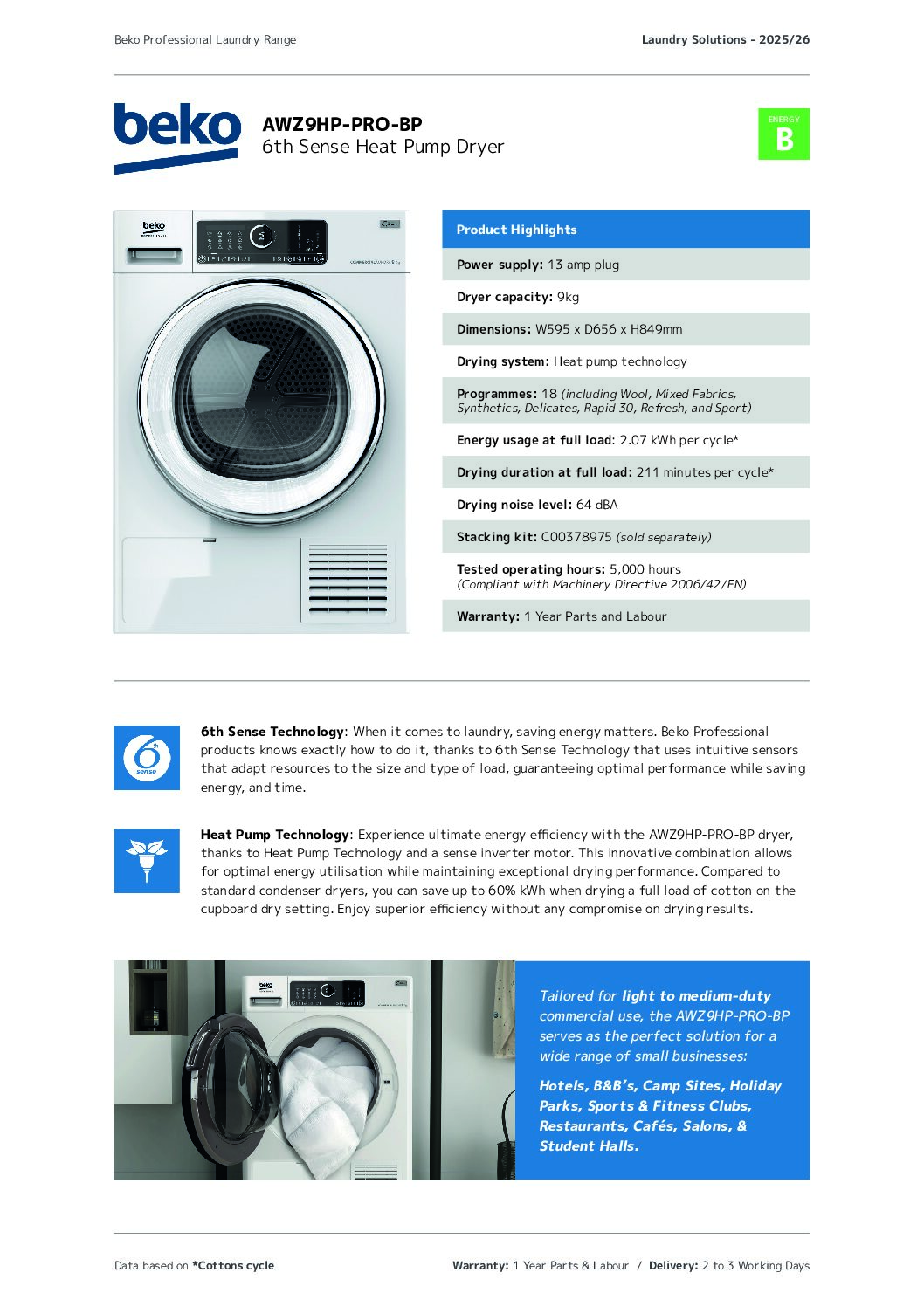 This commercial laundry bundle pairs the Beko Professional AWB912-PRO 9kg washer with the matching Beko Professional AWZ9HP-PRO 9kg heat pump condenser dryer to provide a complete, efficient wash-and-dry solution for professional environments. It is ideally suited to care settings, salons, gyms, staff facilities, holiday lets and other light-commercial laundry rooms where reliability, hygiene and energy efficiency are essential.