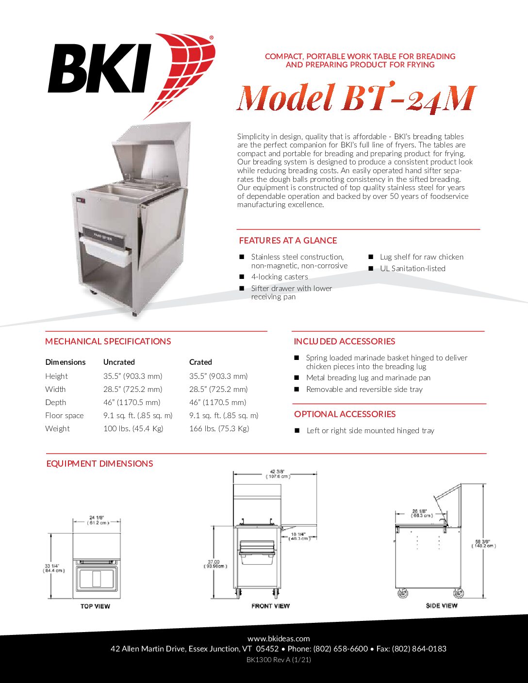 - Spring-loaded, hinged marinade basket for straightforward transfer into the breading lug