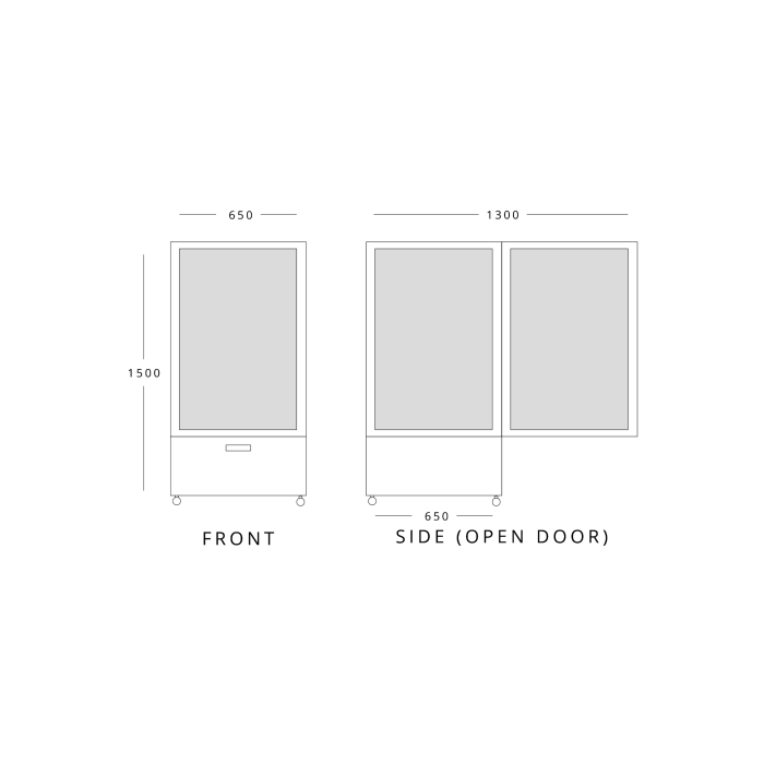 • 1500mm (h) x 650mm (w) x 650mm (d)