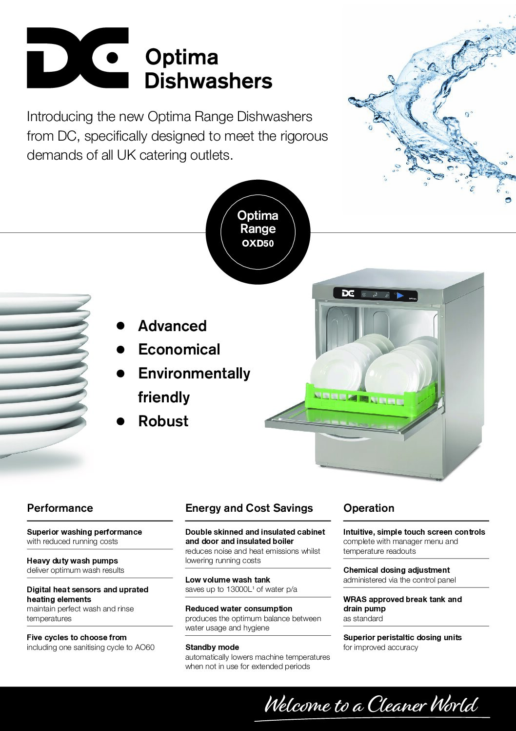 DC OXD50A D Optima Dishwasher w/ Break-Tank & Drain Pump offers advanced cleaning performance and efficiency. Equipped with an intuitive TFT touch screen, users can easily select from four adjustable wash cycles, including ECO and self-clean options. Additional features such as chemical dosing control, thermolock, and ECO standby mode optimise performance and minimise environmental impact. Robust construction, including double-skinned insulated panels and a hermetic door seal, ensures durability and energy efficiency. The washer’s advanced filtration system and powerful pumps guarantee spotless results, while ergonomic design and easy-to-remove components simplify maintenance.