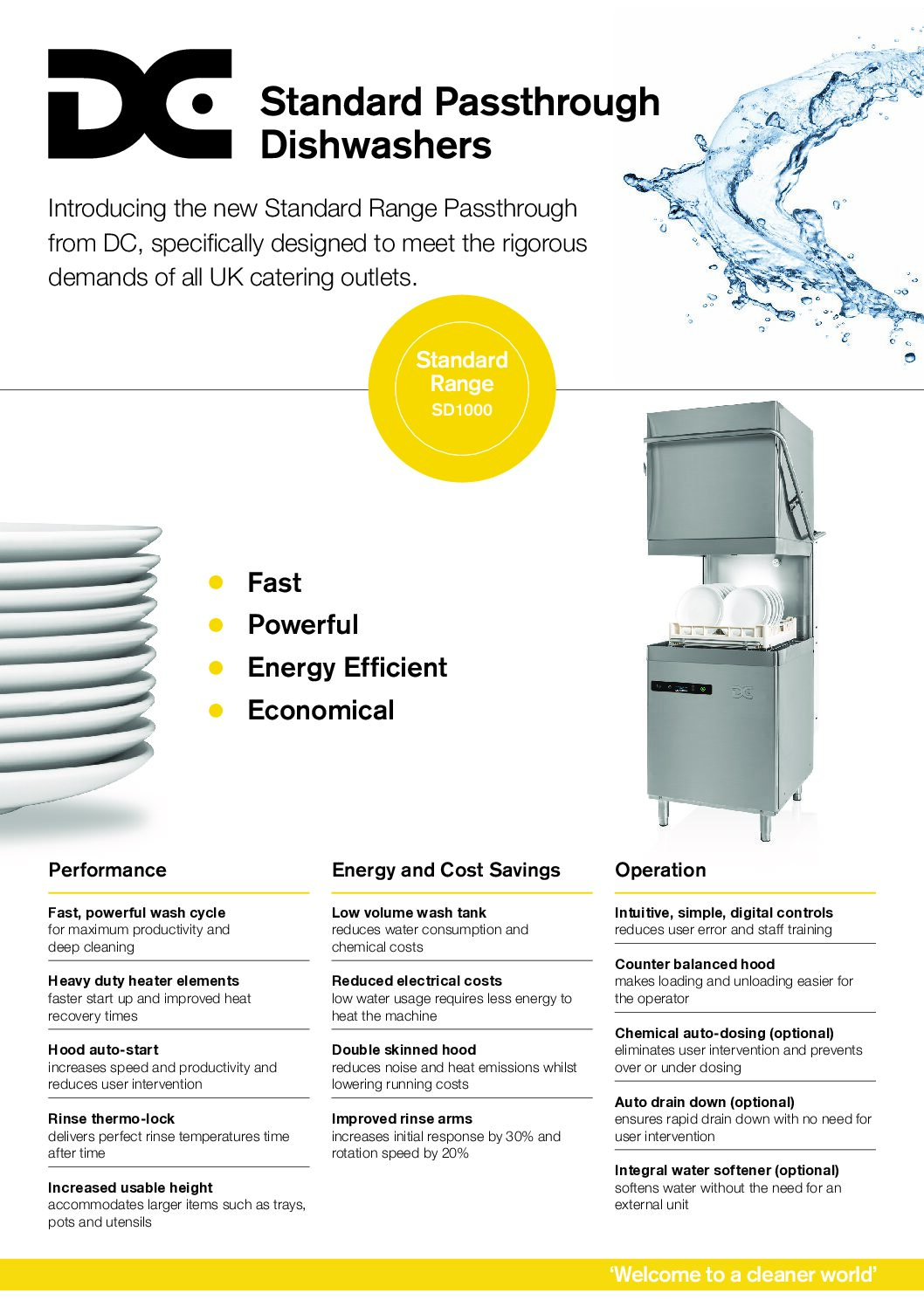 DC SD1000 CP D Standard Passthrough Dishwasher w/ Chemical Pump & Drain Pump 500mm Basket is the latest upgrade to DC’s popular Standard range. This advanced model features a sleek LCD display and soft-touch controls for effortless operation. Choose from 4 fixed wash cycles or customise your cleaning with the innovative “My Wash” option. Key features include integral chemical dosing, selectable standby modes, and real-time temperature monitoring for optimal performance and energy efficiency. Built with a heavy-duty wash pump and double-skinned hood, the SD1000 range delivers exceptional cleaning results while minimising noise, specifically designed to meet the rigorous demands of all UK catering outlets.