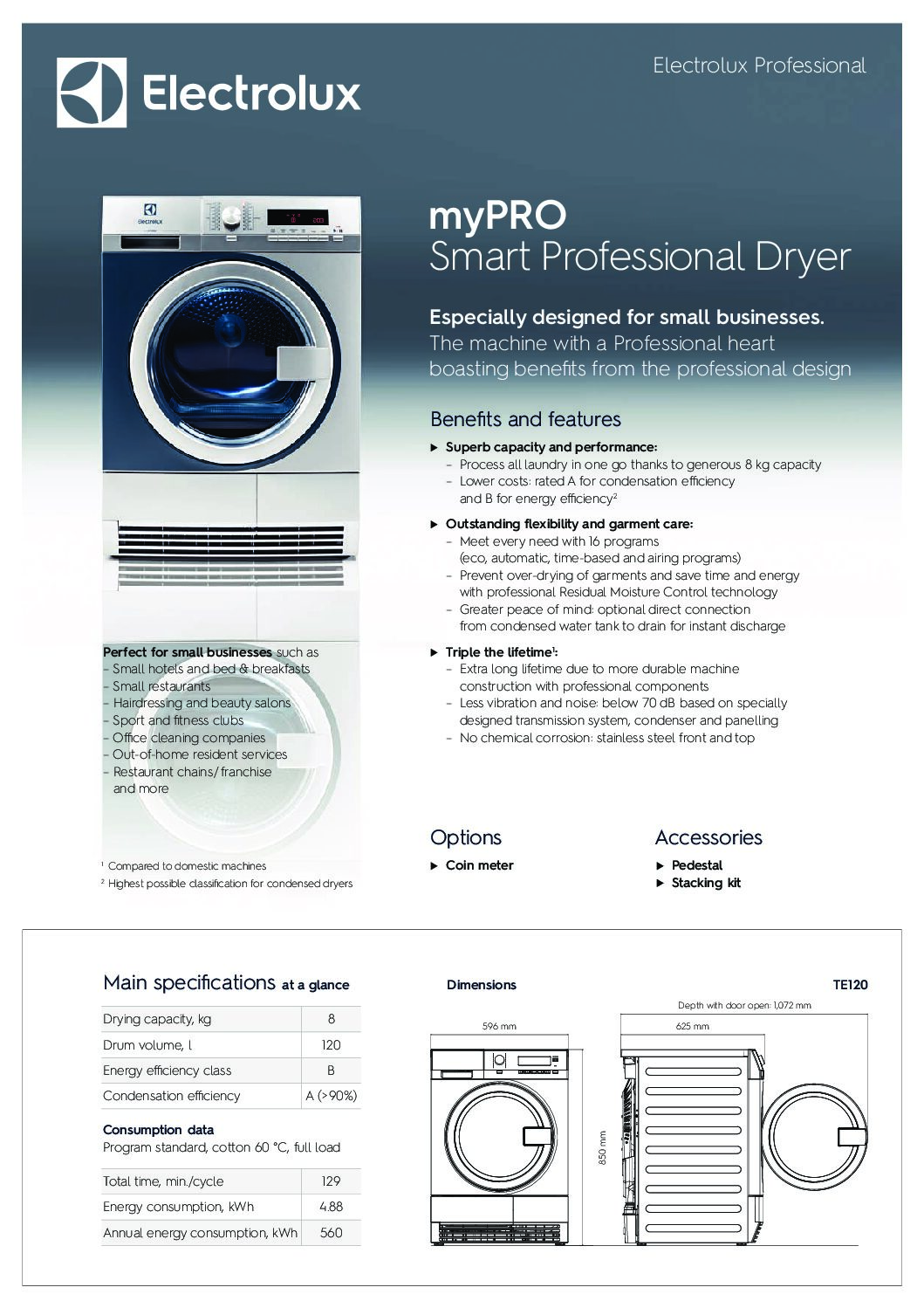 Electrolux TE1120 Condenser Tumble Dryer, 8kg is the perfect addition to your laundry room, offering efficient, safe and quick drying. The Electrolux My Pro Tumble Dryer has 16 professional programs to meet every need – eco, automatic, time-based and airing programs. These settings offer greater piece of mind, with a condensed water tank and drain connection for direct discharge, helpings clothes dry faster. Especially designed for small businesses, the Electrolux My Pro Tumble Dryer is perfect for drying any garment, with real-time control of moisture levels inside garments that allows for shorter drying cycles and prevents fibres from over-drying, to help maintain the longevity of clothing and linen.