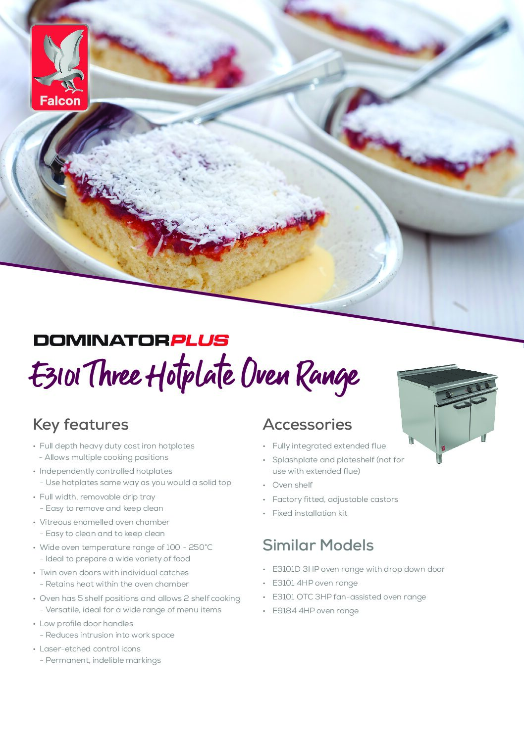 The Falcon E3101 3HP Dominator Plus is part of Falcon’s all-electric Dominator Plus range, providing a dependable alternative where gas is not available or preferred. Combining three heavy-duty electric hotplates with a GN-compatible oven, this range is built for consistent performance and long service life.