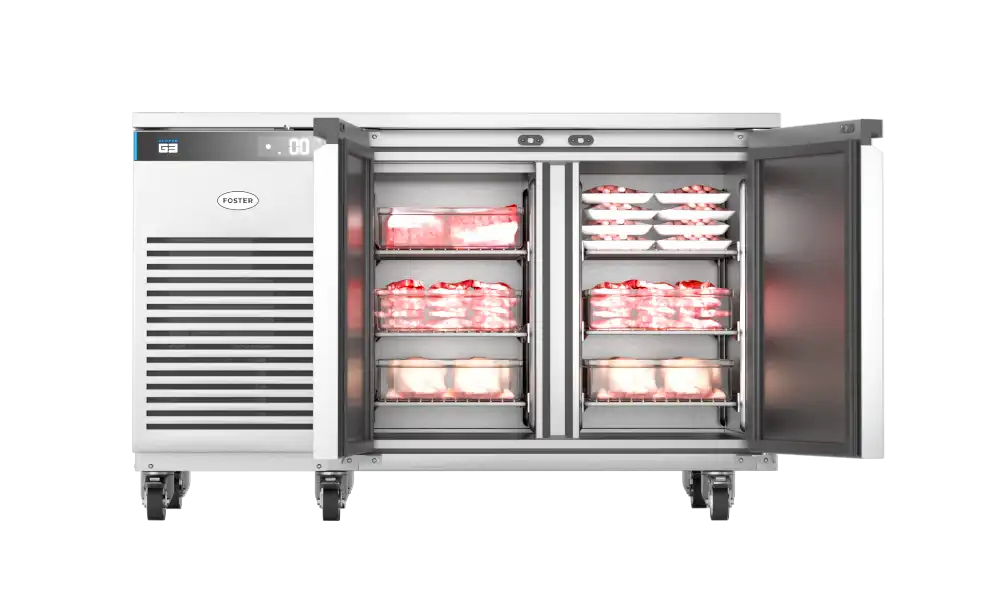 The Foster EP1/2M is a 280 L two-door counter refrigerator designed specifically for safe meat storage. It maintains precise –2 °C to +2 °C temperatures for product safety and freshness, offering reliable performance in compact professional kitchens. Combining durability with energy-efficient technology, it’s a practical, hygienic choice for butchers, restaurants and catering operators.