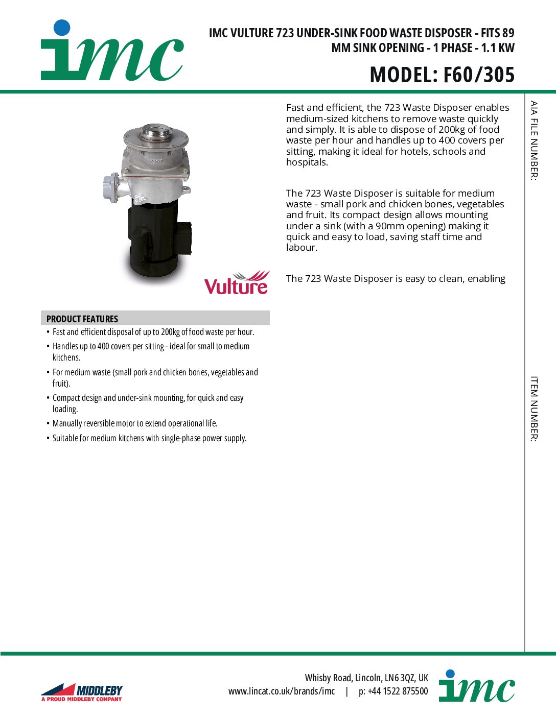IMC F60/305 Vulture 723 Under-sink Food Waste Disposer is fast and efficient, and enables medium-sized kitchens to remove waste quickly and simply. It is able to dispose of 200kg of food waste per hour and handles up to 400 covers per sitting, making it ideal for hotels, schools and hospitals.