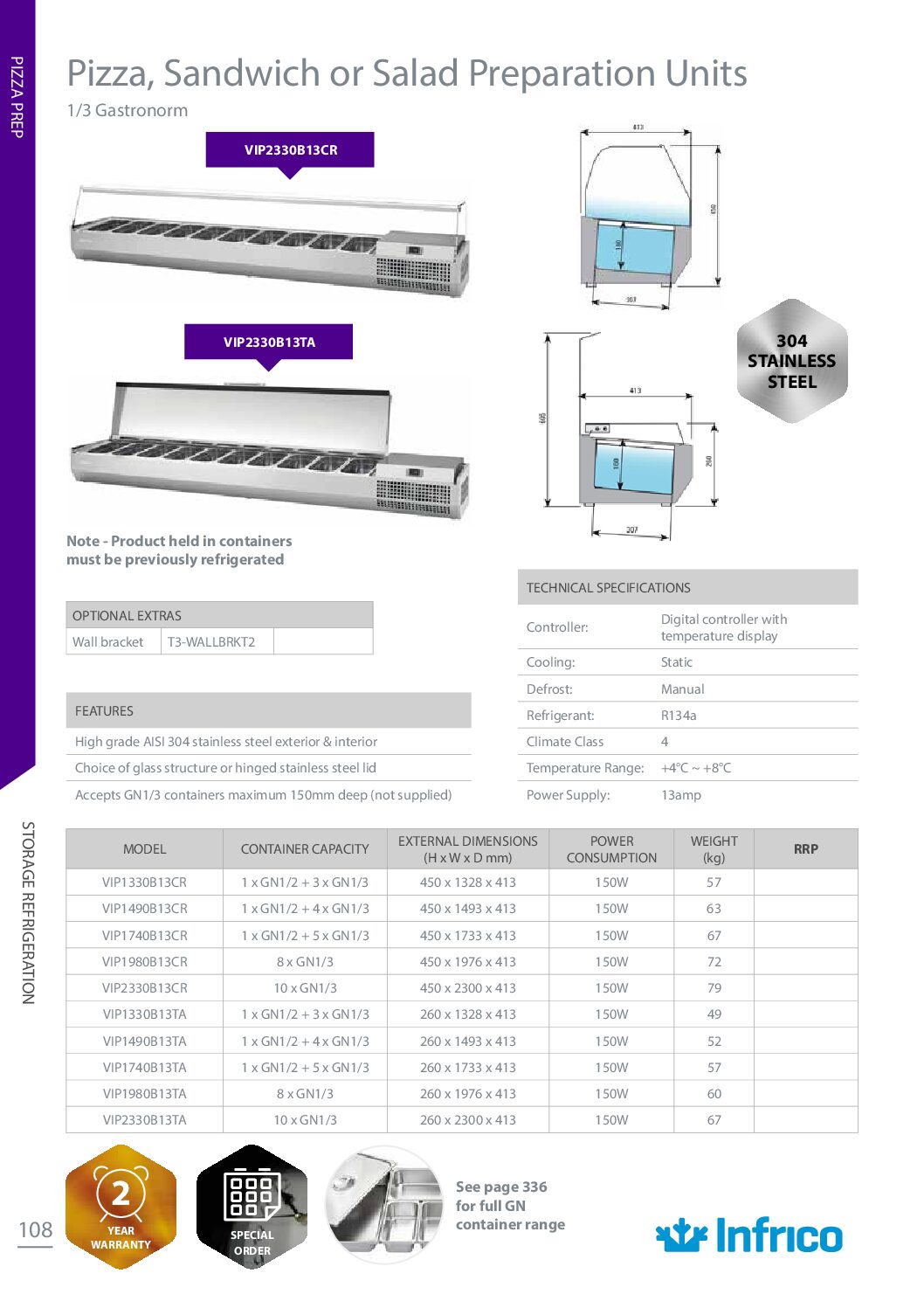 INFRICO VIP2330B13CR 1/3 Gastro Prep Top with Glass Cover 2300mm (w) *Clearance Stock*  is a spacious refrigerated prep top, ideal for busy kitchens. Made from high-grade AISI 304 stainless steel for durability and hygiene. This unit has a generous 2300mm width, perfect for accommodating multiple food prep tasks. The clear glass cover provides easy product visibility while maintaining chilled temperatures. It’s designed to hold GN 1/3 sized containers up to 150mm deep (containers sold separately).