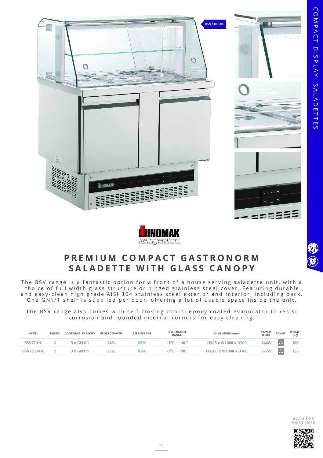 The BSV7300 model features a new design of glass structure, a digital controller with temperature display, ventilated cooling and comes with a long warranty period (3 years) offered as a result of confidence in the reliability of the Inomak range of it’s refrigerated units.
