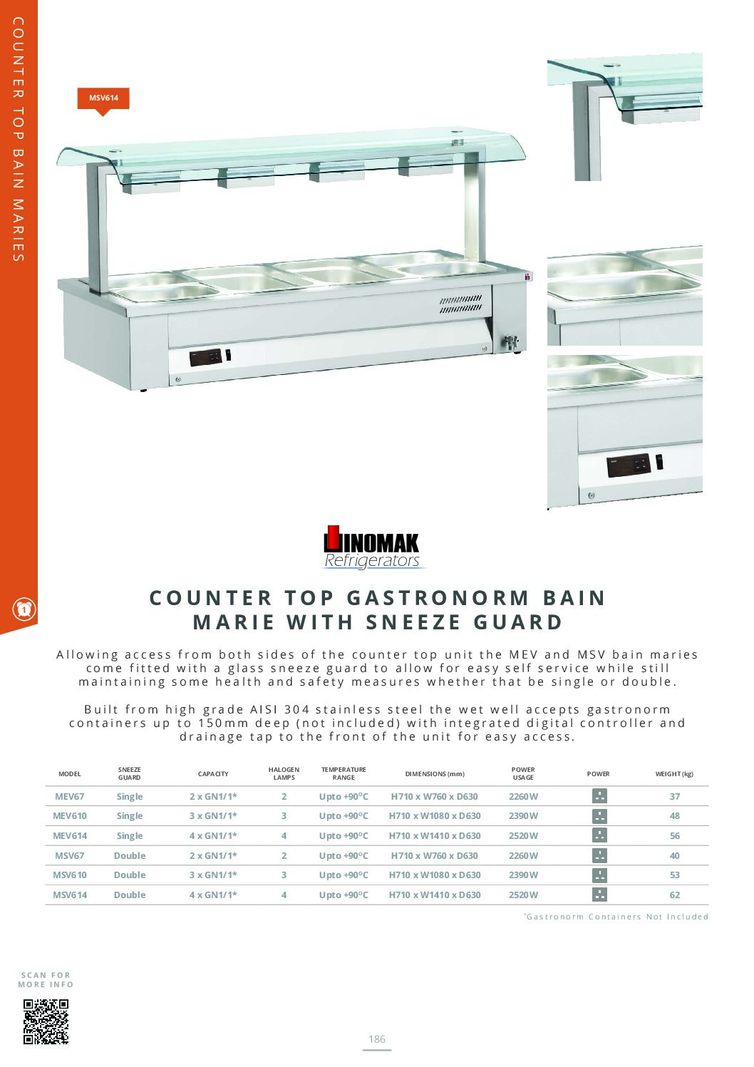 The MEV67 model is part of the range of 3 countertop bain maries with sneeze guard of varying widths; features include a digital controller with temperature display, wet well bain marie with easy access drain tap and is constructed of high grade AISI 304 stainless steel exterior and interior. A one year parts and labour warranty is provided as standard as a result of confidence in reliability of the range