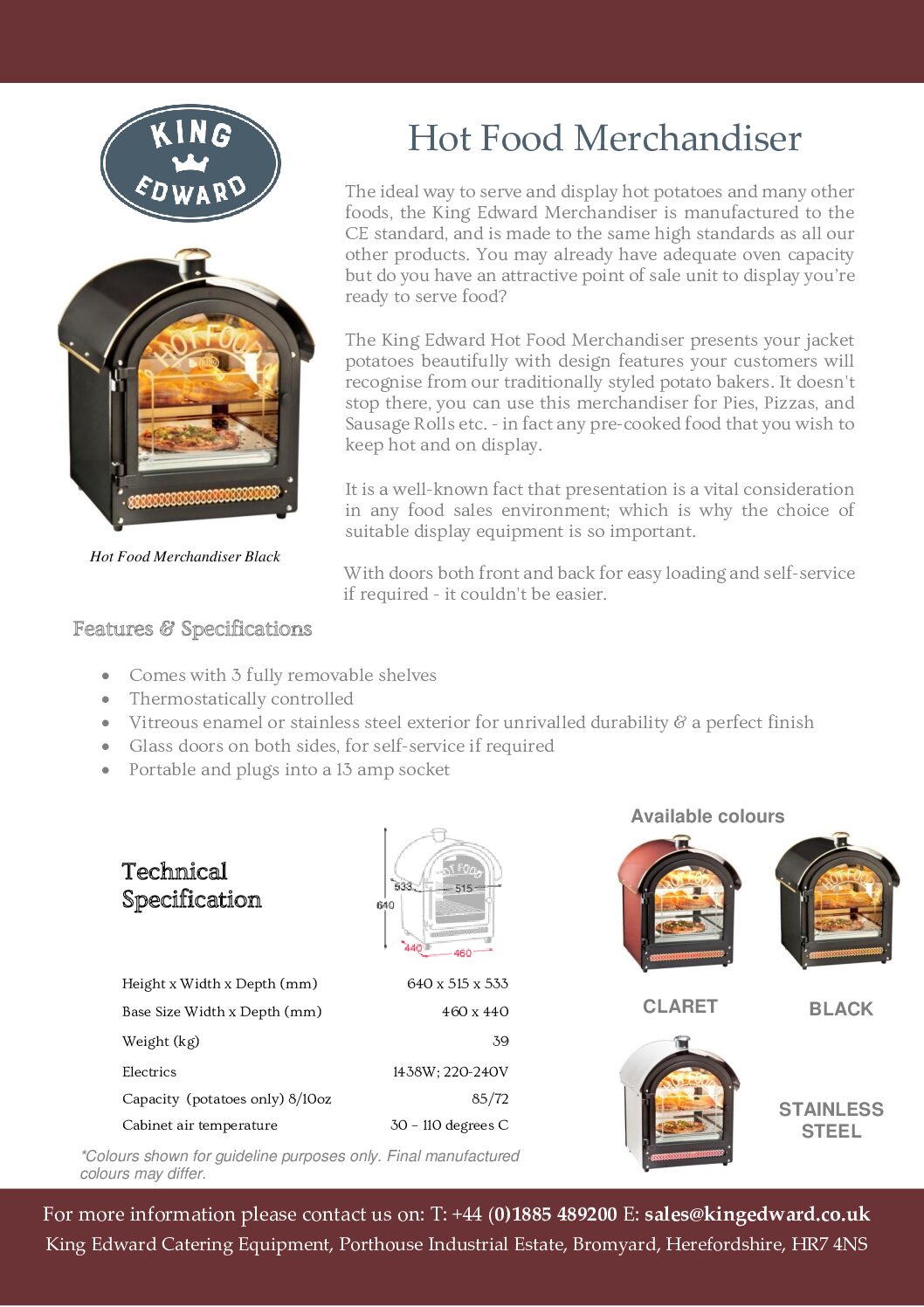 King Edward HFMV Prestige Hot Food Merchandiser is the perfect solution for showcasing and serving not just hot potatoes, but a variety of delicious foods. Manufactured to meet CE standards and upholding the high quality of all King Edward products, this merchandiser is ideal if you already have sufficient oven capacity but lack an attractive way to display your ready-to-serve offerings.