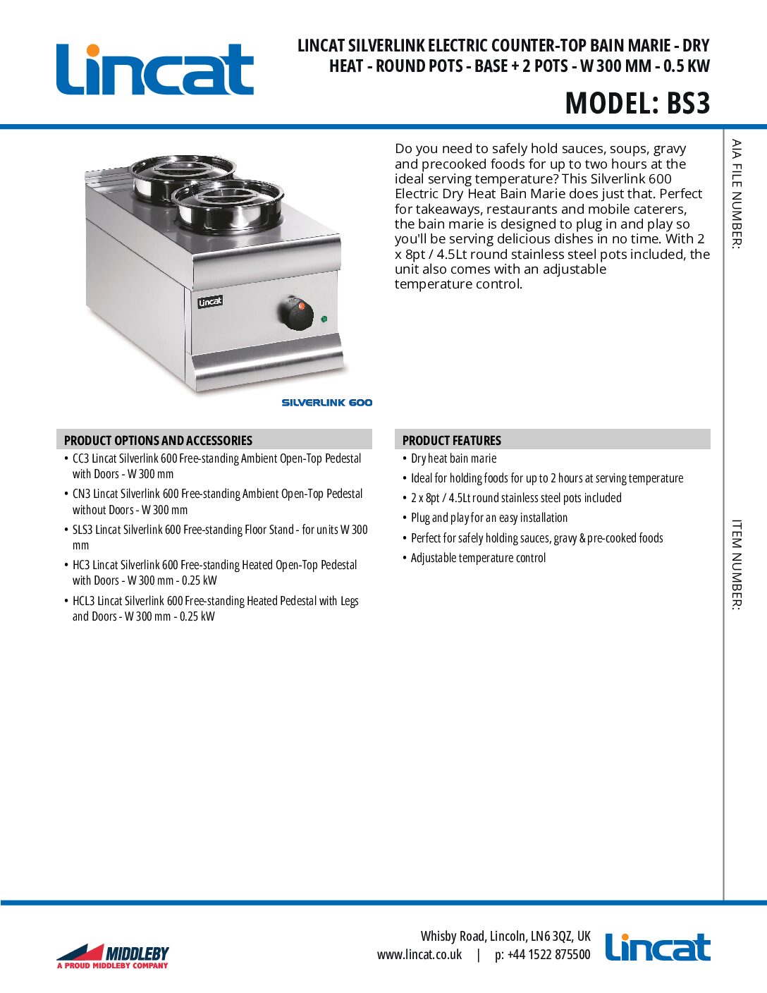 Lincat BS3 Dry Heat Electric Bains Marie is part of the Lincat Silverlink range which is modular 600mm deep prime cooking equipment. (light-medium duty)