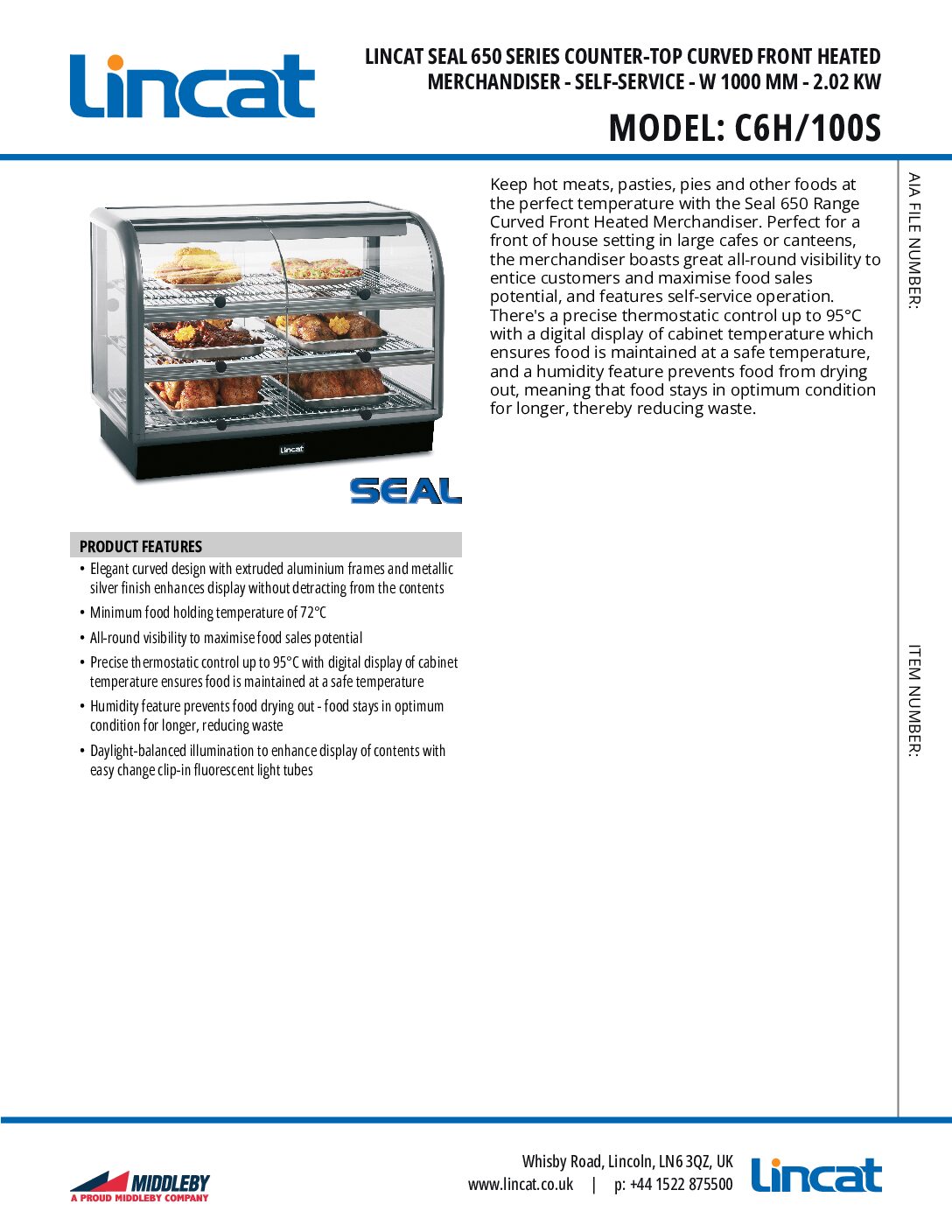 Lincat C6H/100S Curved Front Heated Merchandiser is part of the Seal range. Seal is a comprehensive range of heated, refrigerated and ambient food display units. From rectangular or curved front Merchandisers, to Food Display Bars, Heated Displays, Pie Cabinets and Upright Heated Merchandisers with built-in oven, there’s a Seal product to suit every need.