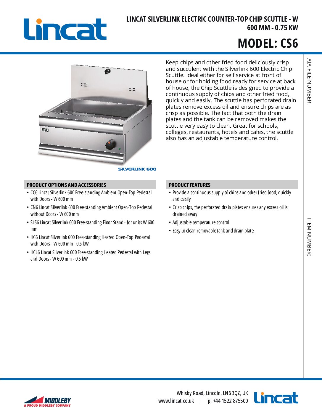 Lincat CS6 Silverlink 600 Electric Counter-top Chip Scuttle 600mm (w) is part of the range of quality cooking equipment from Lincat. Ideal either for self service at front of house or for holding food ready for service at back of house, the Chip Scuttle is designed to provide a continuous supply of chips and other fried food, quickly and easily. The scuttle has perforated drain plates remove excess oil and ensure chips are as crisp as possible. The fact that both the drain plates and the tank can be removed makes the scuttle very easy to clean.