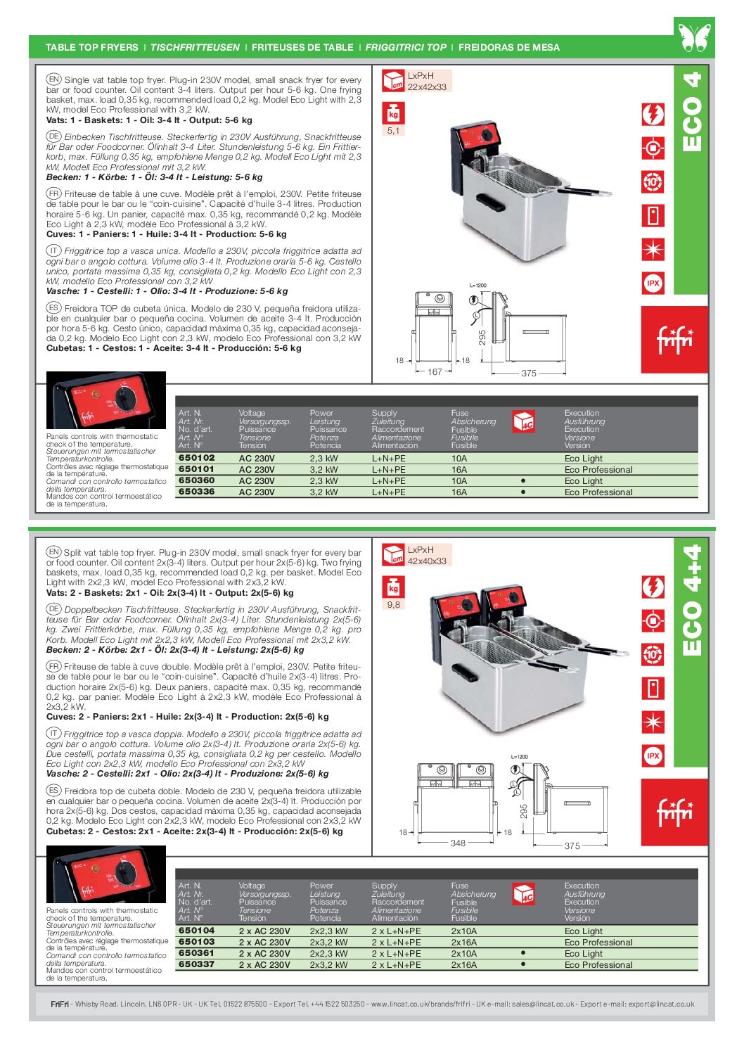 Lincat FriFri Eco 4+4 Twin Tank Counter Top Electric Fryer 2 x 3-4L is part of the range of FriFri Frita+ and Eco countertop fryers that include both Single and Twin Tank Fryers of varying capacities and are supplied with basket/s as standard.
