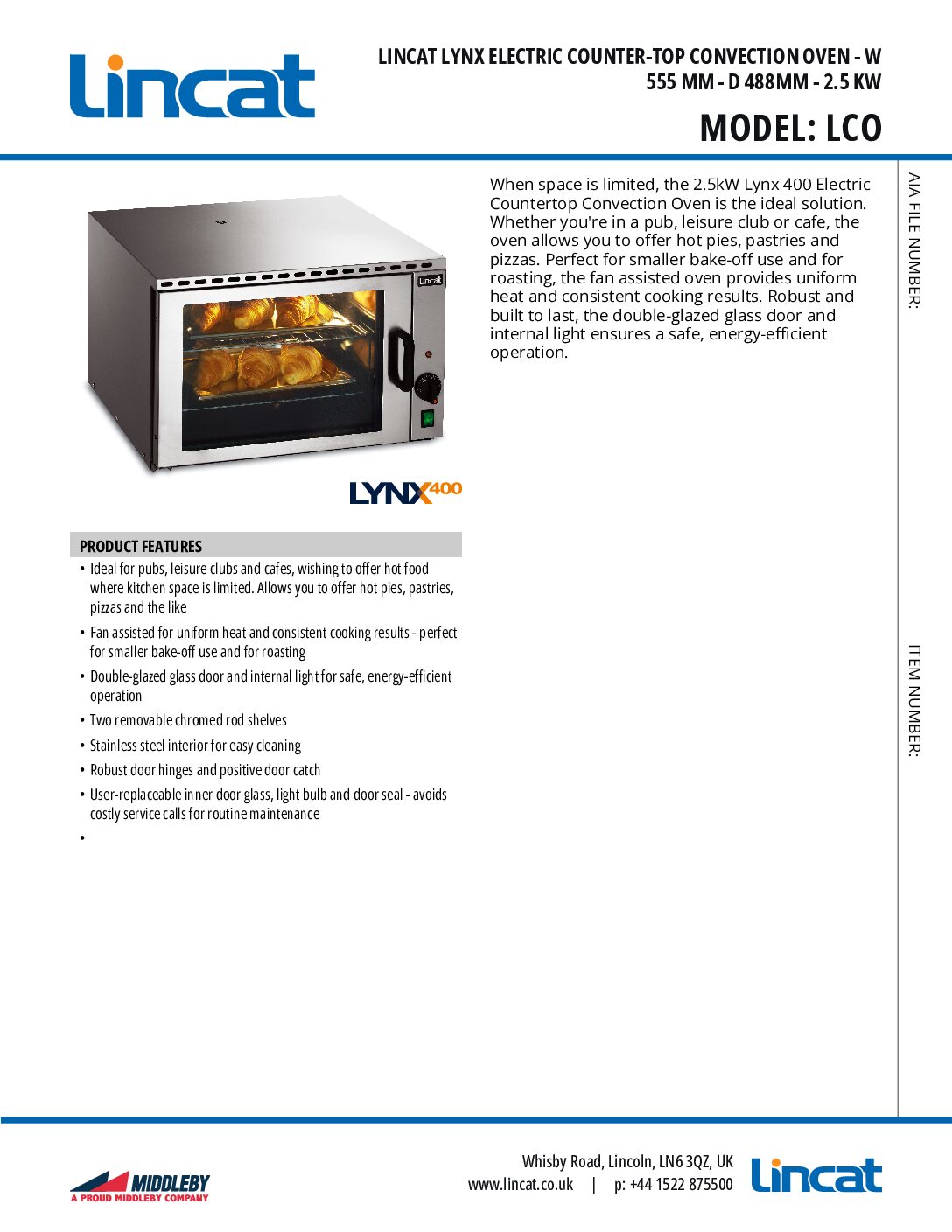 LINCAT LCO Lynx 400 Electric Countertop Convection Oven 33L is part of the electric Lynx 400 series designed to be portable. The units are compact, but what they lack in size they more than make up for in quality. There’s no complicated set up process with the Lynx 400 series. They’re ready to go immediately, which means you only have to think about the range of delicious dishes you’re going to create.