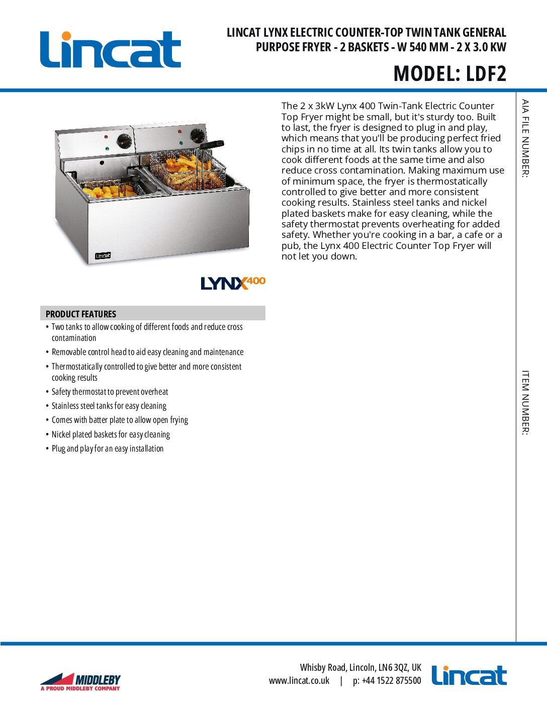 Lincat LDF2 Lynx 400 Electric Counter-top Twin Tank 2 Basket Fryer 2 x 4L is part of the range of quality cooking equipment from Lincat. The LDF2 fryer might be small, but it’s sturdy too. Built to last, the fryer is designed to plug in and play, which means that you’ll be producing perfect fried chips in no time at all. Its twin tanks allow you to cook different foods at the same time and also reduce cross-contamination. Making maximum use of minimum space, the fryer is thermostatically controlled to give better and more consistent cooking results. Stainless steel tanks and nickel-plated baskets make for easy cleaning, while the safety thermostat prevents overheating for added safety. Whether you’re cooking in a bar, a café or a pub, the Lynx 400 Electric Counter Top Fryer will not let you down.