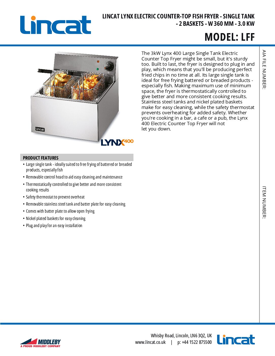 Lincat LFF Lynx 400 Electric Counter-top Fish Fryer Single Tank 2 Baskets 5L is part of the range of quality cooking equipment from Lincat. The LFF might be small, but it’s sturdy too. Built to last, the fryer is designed to plug in and play, which means that you’ll be producing perfect fried chips in no time at all. Its large single tank is ideal for free frying battered or breaded products – especially fish. Making maximum use of minimum space, the fryer is thermostatically controlled to give better and more consistent cooking results. Stainless steel tanks and nickel-plated baskets make for easy cleaning, while the safety thermostat prevents overheating for added safety. Whether you’re cooking in a bar, a cafe or a pub, the Lynx 400 Electric Counter Top Fryer will not let you down.