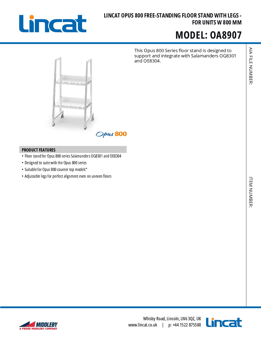 The Lincat OA8907 Floor Stand is designed to provide stable, free-standing support for the Lincat OG8301 gas salamander grill and OE8303 electric salamander grill. Suitable for units 800mm wide, this robust stand positions the salamander at an ergonomic working height while also offering additional shelving and storage space beneath. Ideal for professional kitchens looking to maximise efficiency and maintain a tidy workspace.