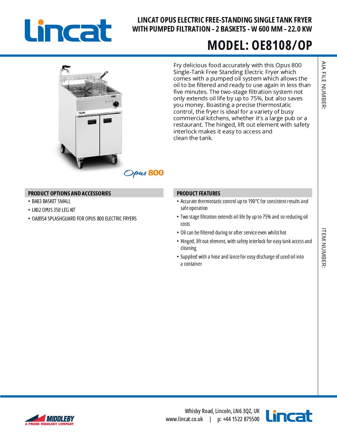 LINCAT OE8108/OP Opus 800 Single Tank Electric Fryer with Pump, 2 Baskets is part of the Opus 800 series, an extensive range of heavy duty prime cooking equipment, including ovens, fryers, griddles, grills and bratt pans, designed, developed and manufactured by Lincat. Built on the success of the Opus 700 series, Opus 800 is larger, heavier, more durable and more powerful too.