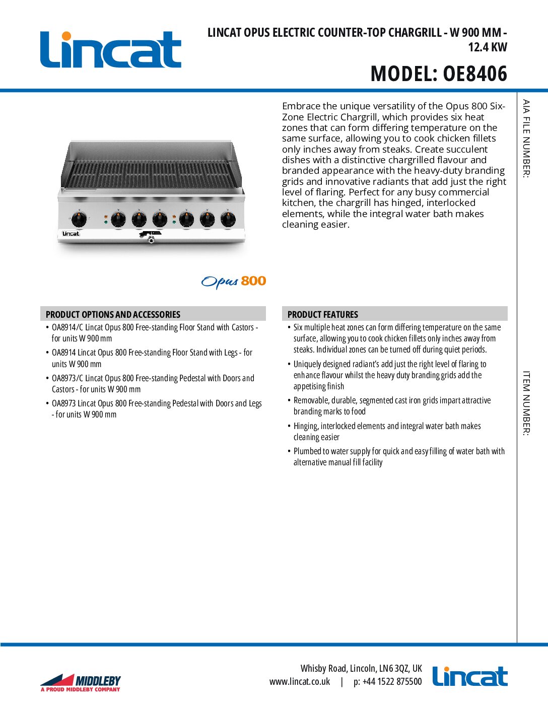 Lincat OE8406 Electric Counter-top Chargrill, 900mm wide is part of the range of uniquely versatile Opus 800 Electric Chargrills, which provides six heat zones that can form differing temperature on the same surface, allowing you to cook chicken fillets only inches away from steaks. In addition, heavy-duty branding grids and innovative radiants add just the right level of flaring, the chargrill has hinged, interlocked elements, while the integral water bath makes cleaning easier.