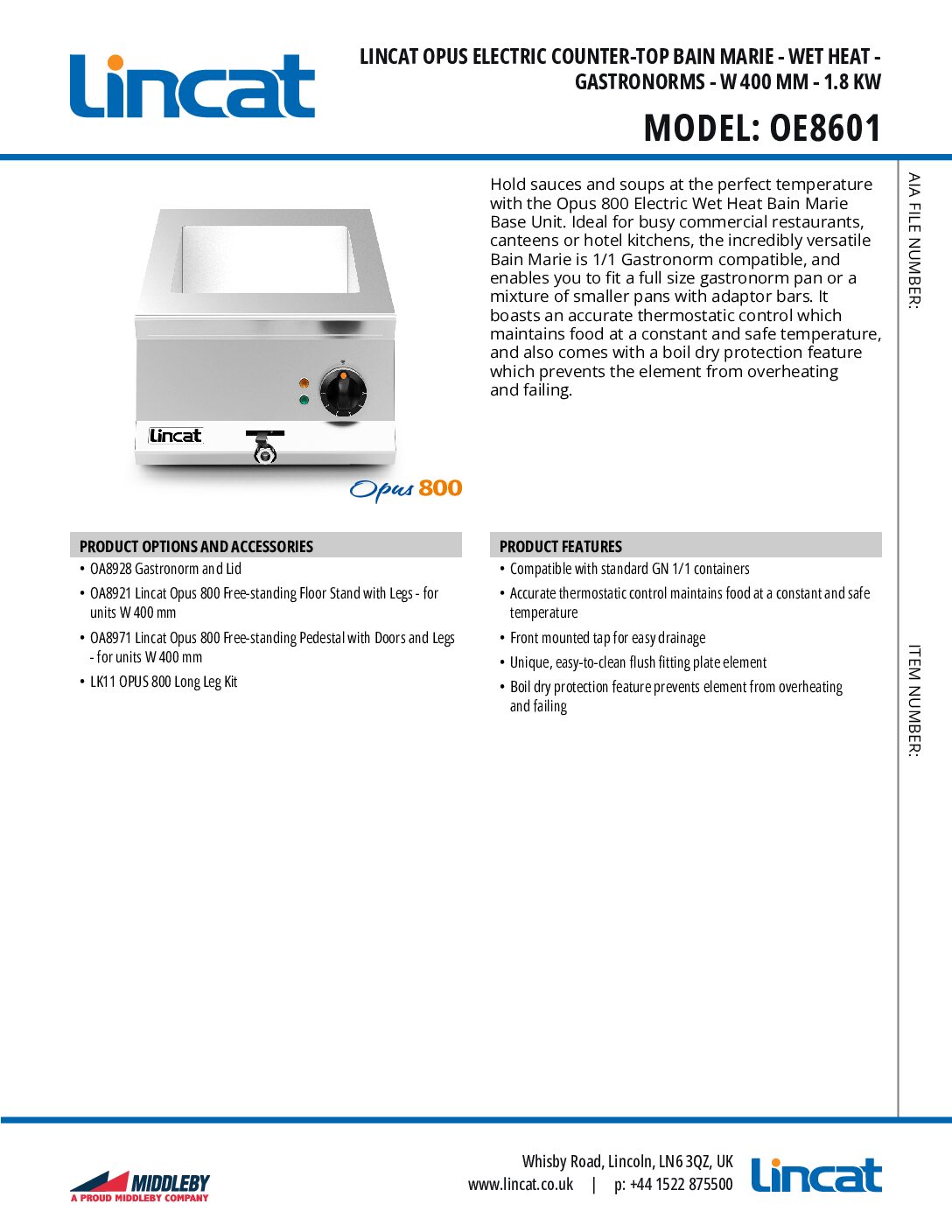 Lincat OE8601 Opus Electric Counter-top Wet Heat Bain Marie is ideal for busy commercial restaurants, canteens or hotel kitchens. The incredibly versatile Bain Marie is 1/1 Gastronorm compatible, and enables you to fit a full size gastronorm pan or a mixture of smaller pans with adaptor bars. It boasts an accurate thermostatic control which maintains food at a constant and safe temperature, and also comes with a boil dry protection feature which prevents the element from overheating and failing.