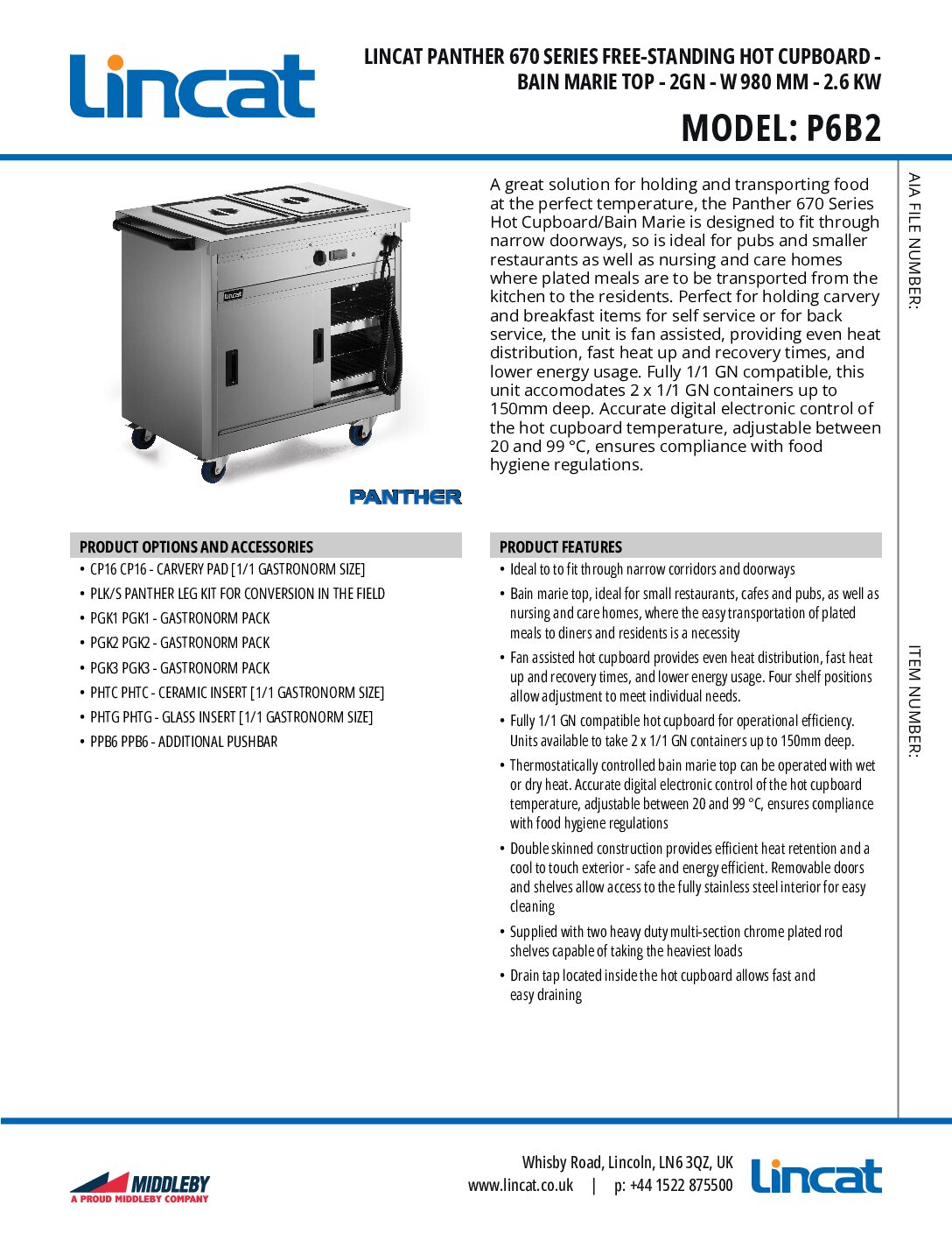 Panther 670 series hot cupboards are supplied as mobile models with heavy duty castors and one push bar.