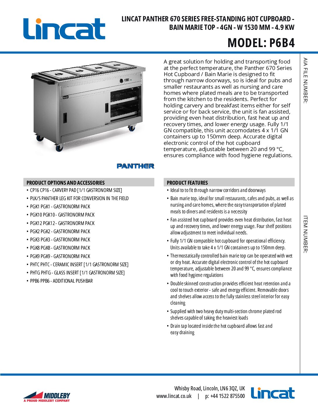 Panther 670 series hot cupboards are supplied as mobile models with heavy duty castors and one push bar.