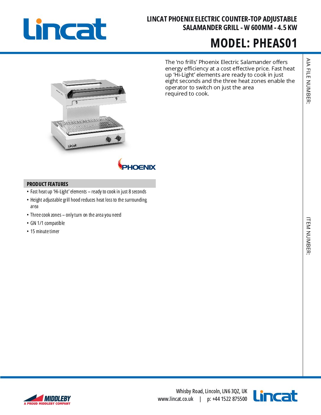 Lincat PHEAS01 Phoenix Electric Counter-top Adjustable Salamander Grill is part of the Phoenix range,  robust and durable, this medium duty series includes both gas and electric models, and has been designed to cope with the day-to-day demands of the busiest of kitchens.