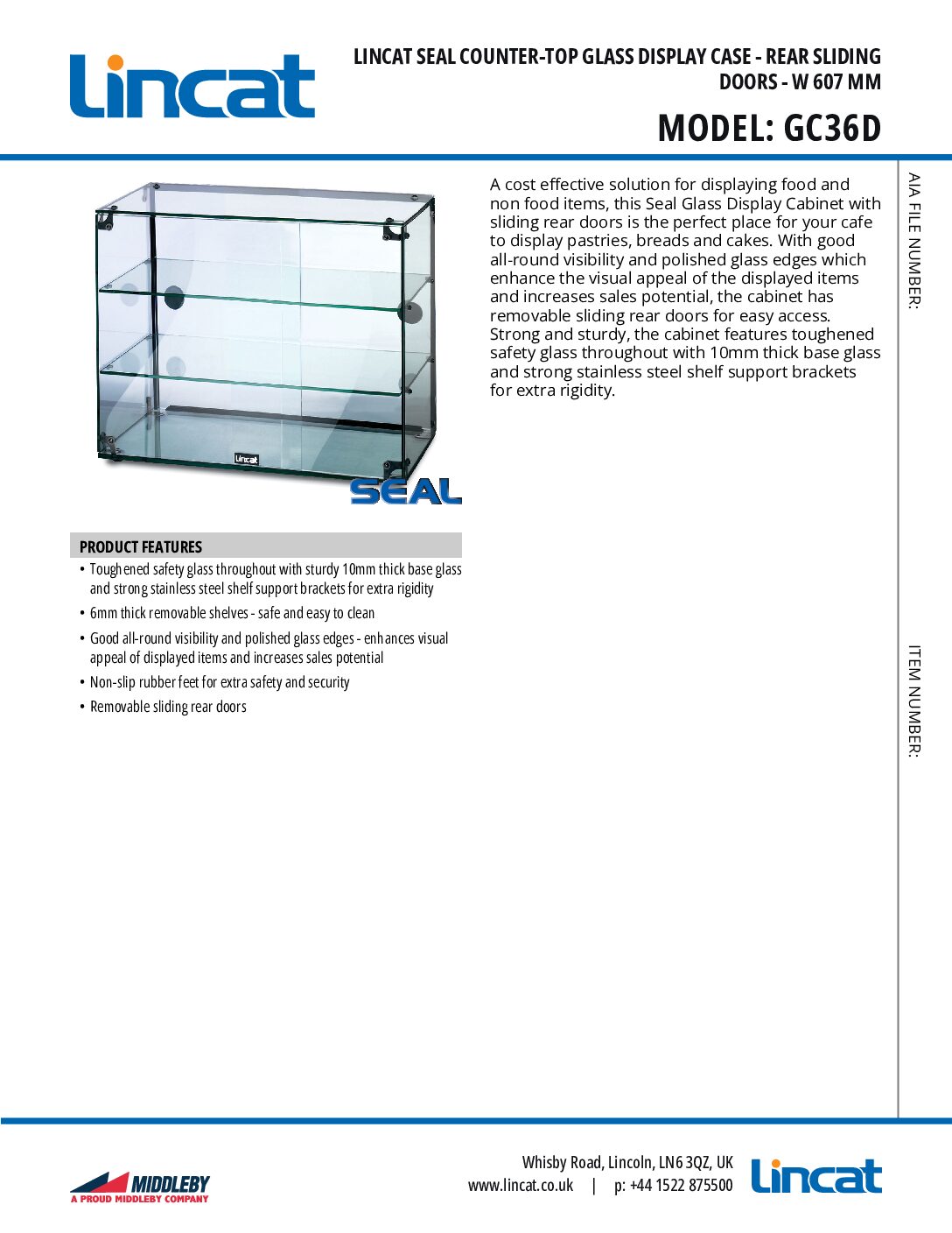 Lincat Seal GC36D – Counter-top Glass Display Case – Rear Sliding Doors – W 607 mm is part of the Seal range of Ambient Glass Display Cases, cost-effective solutions for displaying food and non-food items. The perfect unit for your cafe, deli, coffee shop, or bistro to display pastries, breads, and cakes, with good all-round visibility and polished glass edges that enhance the visual appeal of the displayed items and increase sales potential. Removable sliding rear doors allow for easy access. Strong and sturdy, the cabinet features toughened safety glass throughout with 10mm thick base glass and strong stainless steel shelf support brackets for extra rigidity.