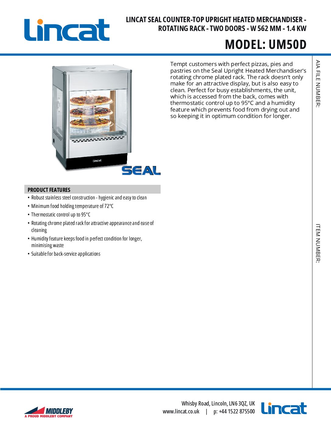 Lincat UM50D Counter-top Upright Heated Merchandiser – Rotating Rack, Double Door offers a space saving solution which is both practical and visually enticing for your customer. This convenient counter top is extremely versatile and ideal for takeaways, cafes and mobile units.