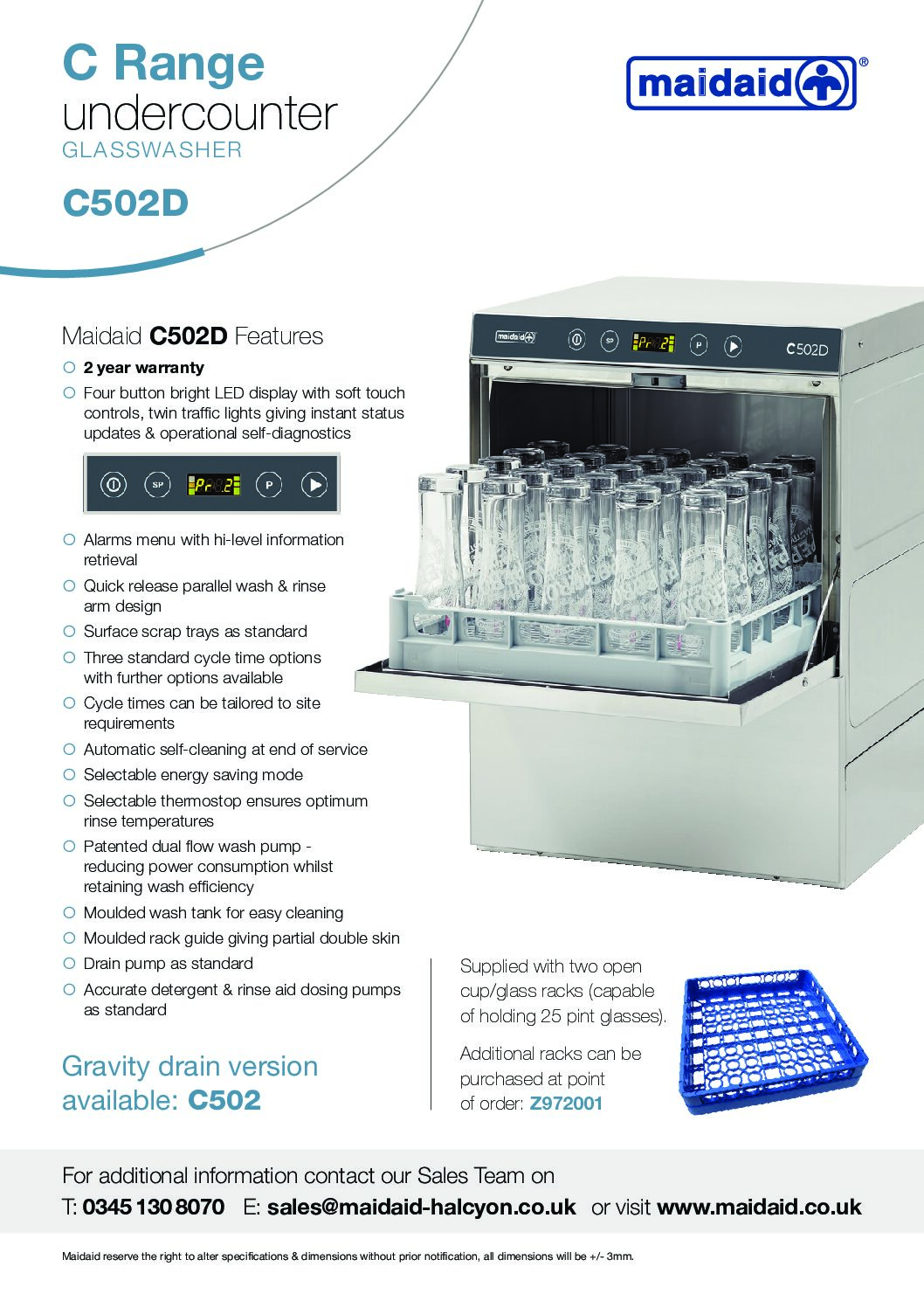 Maidaid C502D Undercounter Glasswasher with Drain Pump – 500mm Basket is part of the Maidaid C Range of Undercounter Glasswashers – a fully electronic machine range offering outstanding value for money.