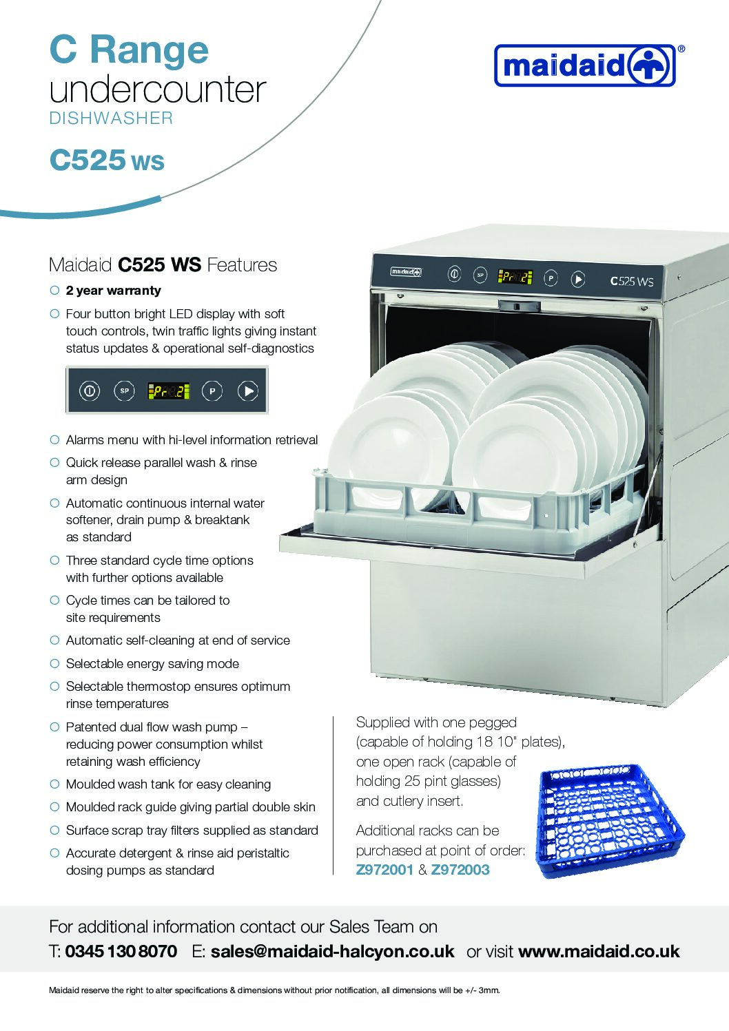 Maidaid C525WS Undercounter Glasswasher with Drain Pump, Water Softener & Break Tank – 500mm Basket is part of the Maidaid C Range of Undercounter Dishwashers and Glasswashers – a fully electronic machine range offering outstanding value for money.