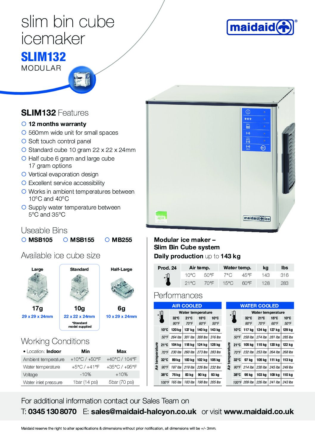 Maidaid SLIM132 Slim Bin Cube Ice Machine is part of the range of three modular units, all 560mm in width designed to fit in small spaces.  All slim bin modular units will require to be mounted on a storage bin (sold separately).