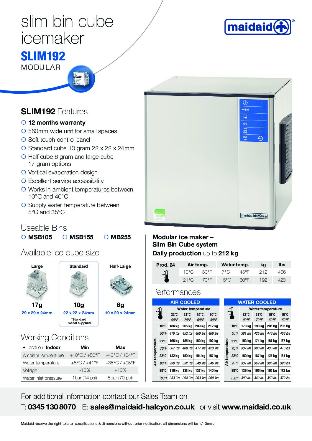 Maidaid SLIM192 Slim Bin Cube Ice Machine is part of the range of three modular units, all 560mm in width designed to fit in small spaces. All slim bin modular units will require to be mounted on a storage bin (sold separately).
