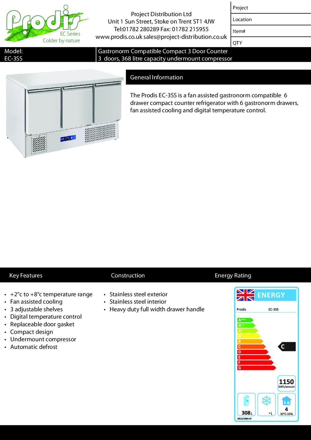 Maximise cold prep space without sacrificing workflow. The Prodis EC-3SS compact saladette counter gives you a robust stainless steel flat-top work surface and a chilled 3-door cabinet beneath — perfect for sandwich, salad, and pizza stations where every centimetre counts. With fan-assisted cooling and a precise digital controller, you can trust consistent holding temperatures service after service.