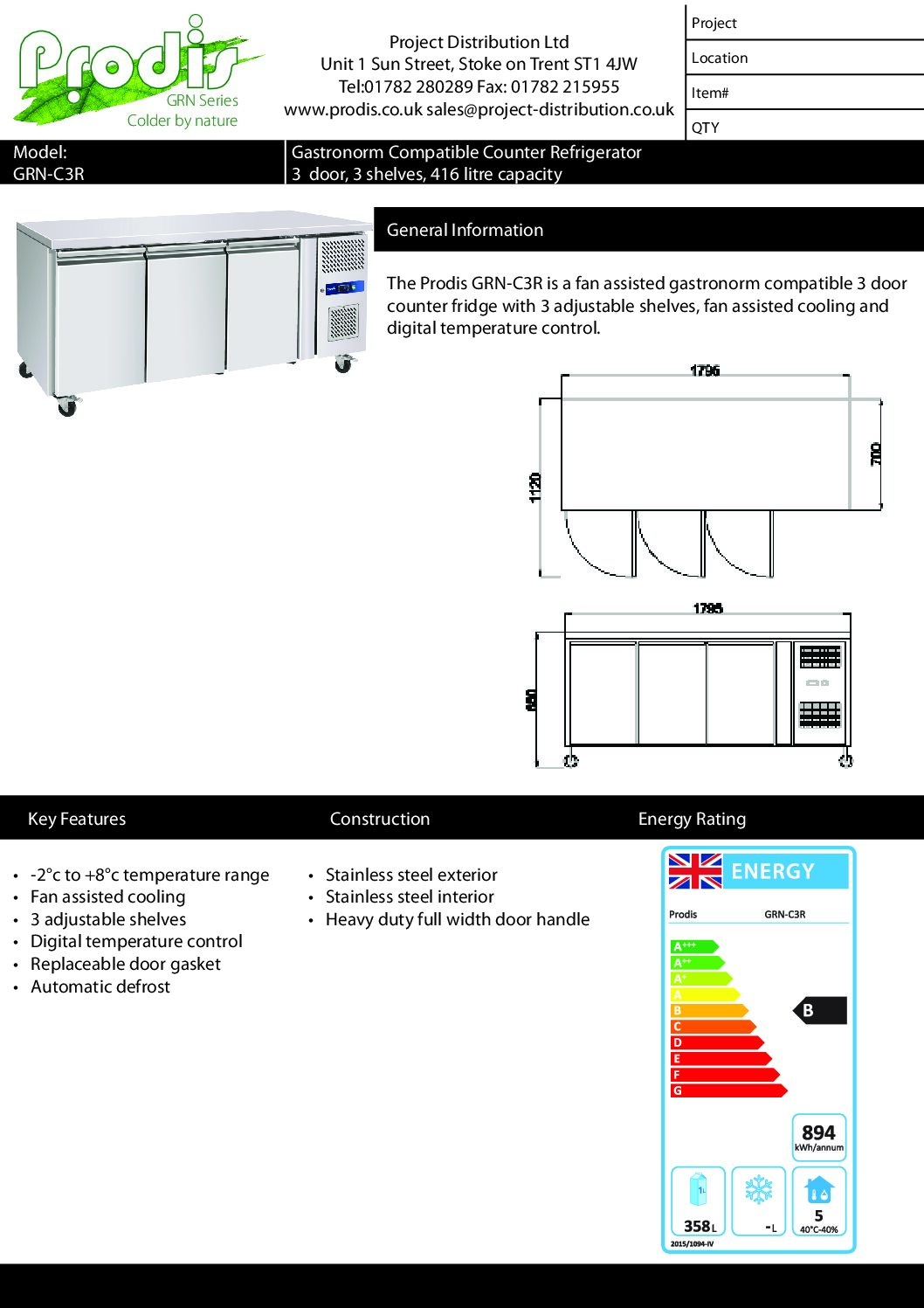 The Prodis GRN-C3R is a professional three-door counter fridge designed for heavy-duty commercial use. Constructed entirely from stainless steel inside and out, it combines strength with hygienic performance. Fully GN compatible with adjustable guide sets and shelves, this versatile counter fridge provides reliable refrigerated storage exactly where it’s needed. A digital temperature controller ensures precise cooling and easy monitoring, while castors make positioning simple.