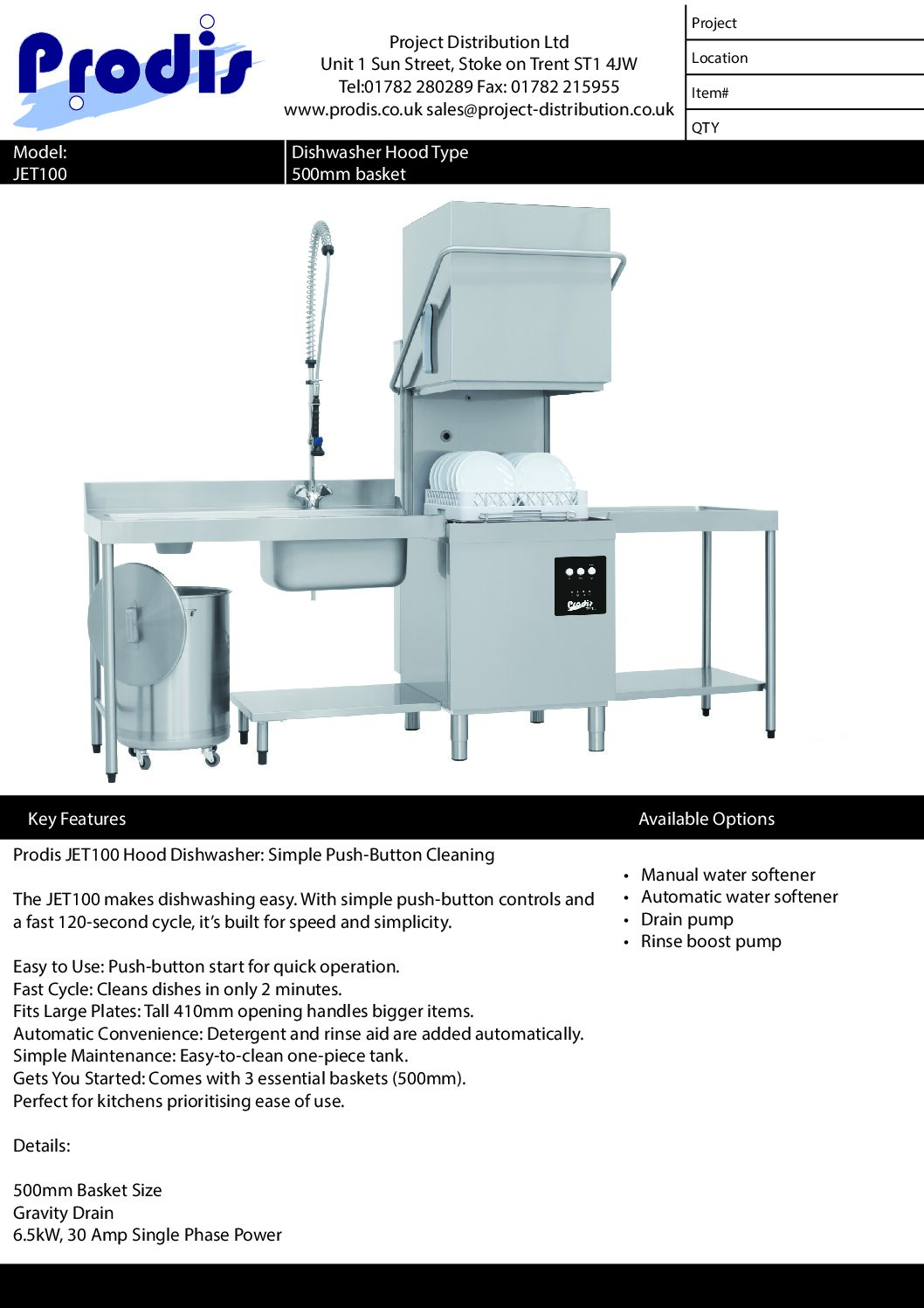The Prodis JET100 hood dishwasher is designed for kitchens that need fast, straightforward dishwashing with minimal fuss. With electromechanical push-button controls and a rapid 120-second wash cycle, it delivers reliable cleaning at an affordable price. A tall 410mm loading height makes it suitable for larger plates and utensils, while automatic rinse aid and detergent dosing simplify operation.
