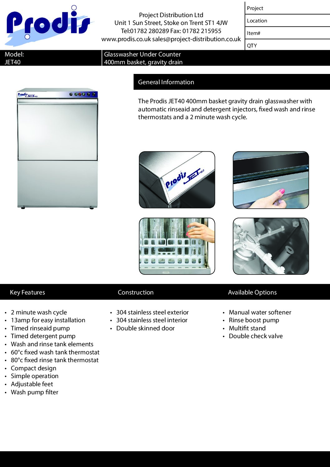 A smart choice for pubs, bars and social clubs that want dependable professional washing without complexity or long cycle times. The JET40 delivers strong cleaning performance, simple controls, and the flexibility to fit where space is tight. Gravity drain configuration makes it suitable for installations where waste is positioned below the outlet — commonly behind bars.