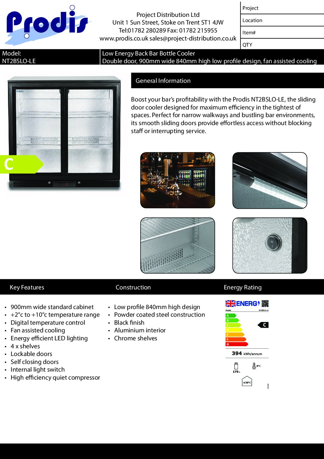 Maximise back-bar space with the Prodis NT2BSLO-LE — a low-energy, low-profile double sliding door bottle cooler built for tight walkways and under-counter installs. With an independently certified C energy rating, eco-friendly R600a refrigerant, and fan-assisted cooling, it chills fast while keeping running costs down. The self-closing sliding doors give a zero-footprint opening, trapping cold air between serves and reducing compressor run-time during busy shifts.