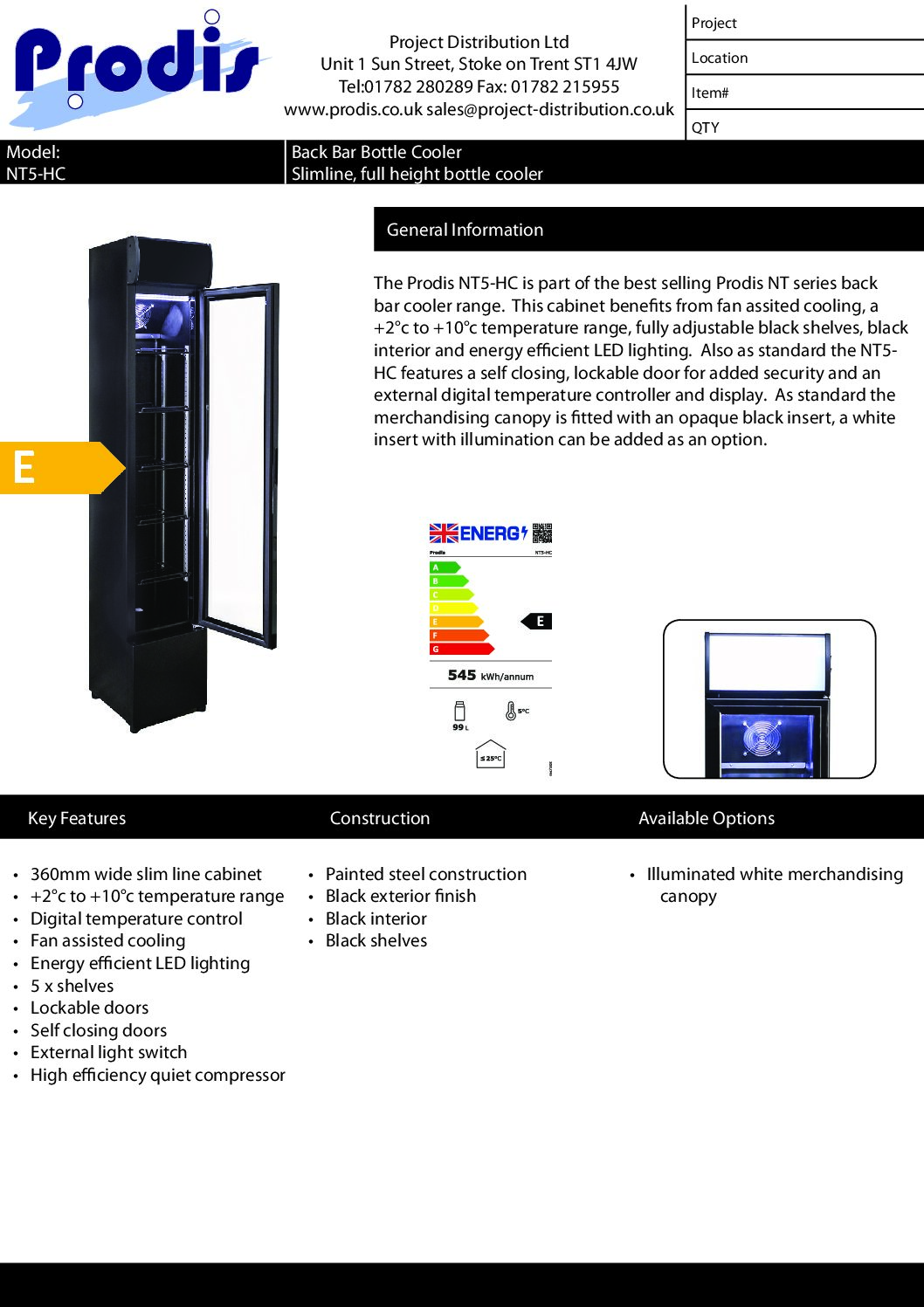 The Prodis NT5-HC is a slimline single door upright bottle cooler designed for style, efficiency, and durability. Finished in hard-wearing black powder-coated steel with a matching black interior, this cooler is perfect for maximising display impact in compact spaces. Its narrow footprint also makes it an excellent infill option between larger units, ensuring no valuable back bar space goes to waste.
