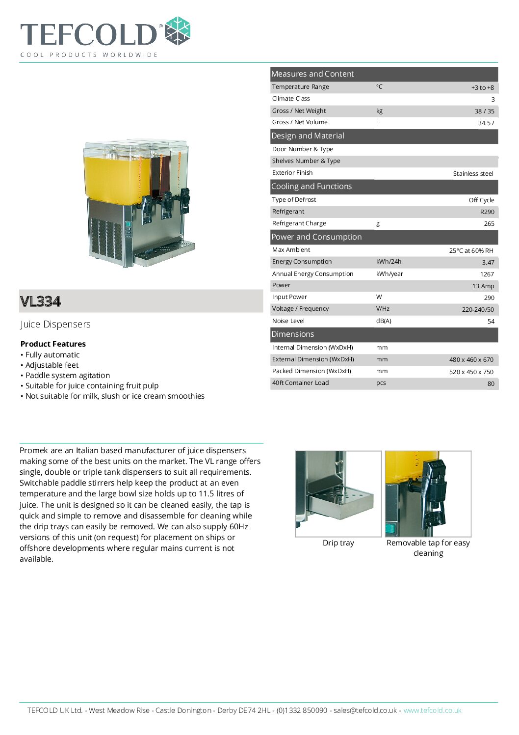 Promek VL334 Juice Dispenser 3 x 11.5L is a top-tier juice dispenser from a renowned Italian manufacturer. This triple-tank model, part of the VL range, is designed to meet diverse needs. Its powerful paddle stirrers ensure even temperature distribution, while the spacious 3 x 11.5-litre bowls accommodate ample juice. The VL334 prioritises ease of use and maintenance: the taps are easily removable for cleaning, and the drip trays can be swiftly removed. For specialised applications like marine or offshore settings, 60Hz versions are available upon request.