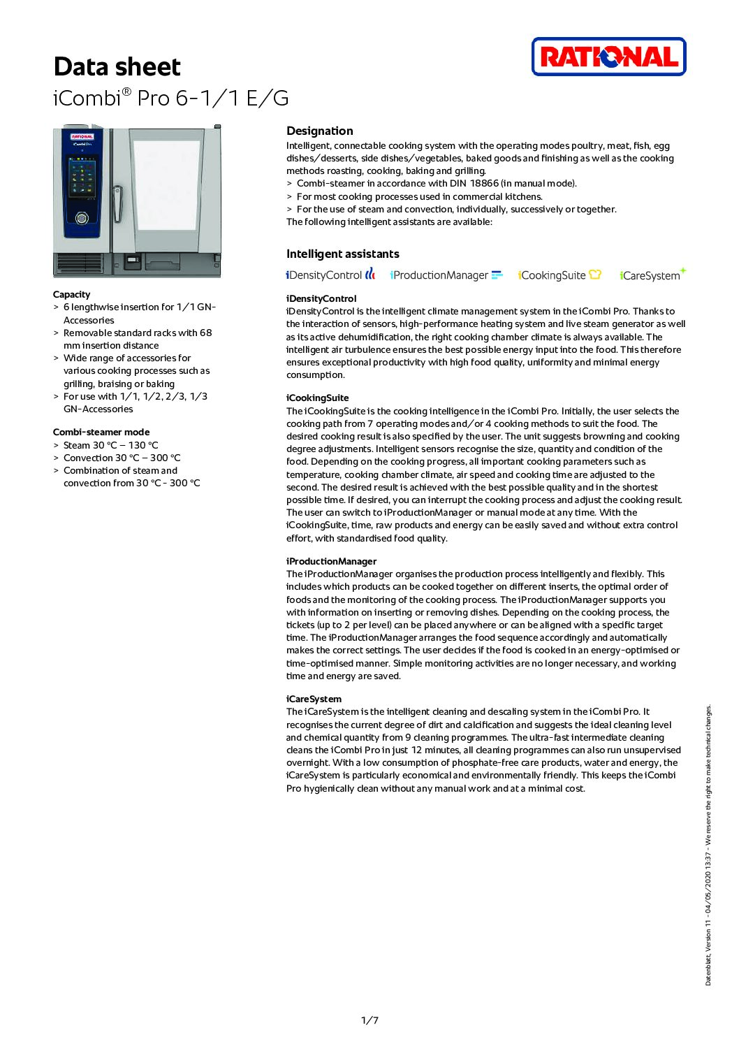 Rational iCombi Pro 6-1/1 Gas Combination Oven 6 Grid, 1/1 GN is part of the exciting new range of electric and gas combi ovens from Rational. The iCombi Pro continuously checks the condition of the food against the desired result, calculates the cooking progress and intelligently adjusts the temperature. This innovative system will monitor each rack individually- you decide if you want the food to start cooking at the same time or finish cooking at the same time. Either way, the iCombi Pro will tell you when something needs to go into the cooking cabinet – et voilà, the food is ready.