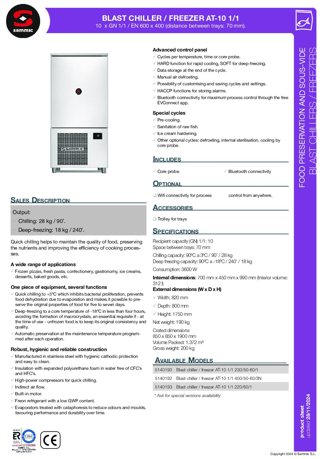 Sammic AT-10 1/1 Blast Chiller (10 x GN 1/1) is part of the range of Sammic Blast Chillers designed to improve the quality and organisation of the work in restaurants, confectioneries, bakeries and ice-cream shop.  Great power and versatility and reliability are the most evident features of Sammic. Blast Chillers/freezers improve the work of operators, leaving more time for creativity. Quick chilling helps to maintain the quality of food, preserving the nutrients and improving the efficiency of cooking processes.