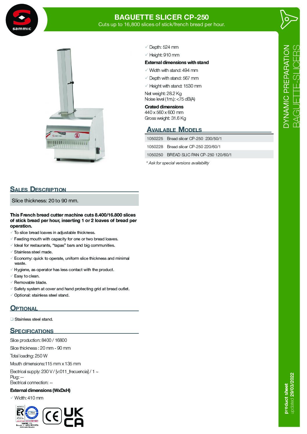 Sammic CP-250 Commercial Baguette Slicer is part of the range of French bread slicers designed to slice bread loaves in adjustable thickness. Quick to operate with uniform slice thickness and minimal waste.